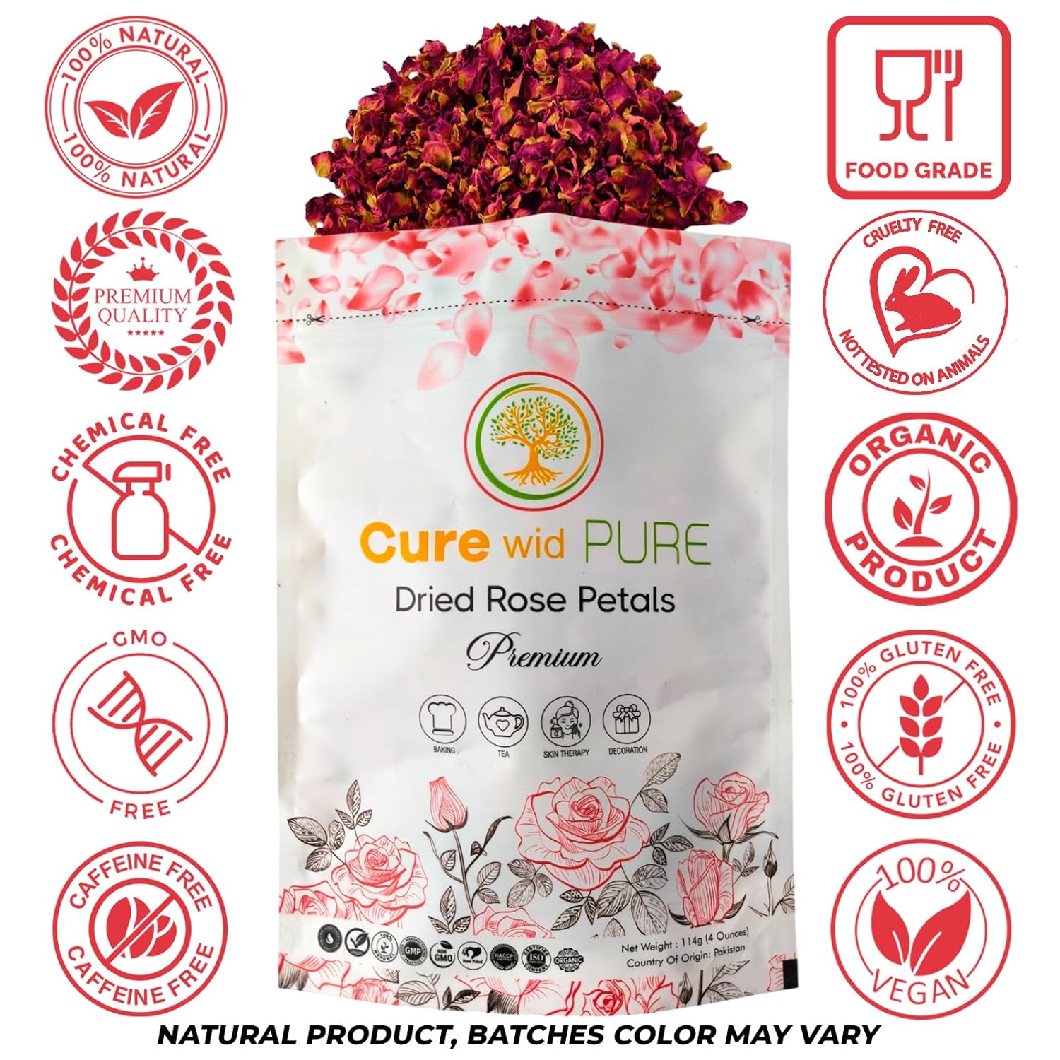 Cure Wid Pure Certified Organic Dried Rose Petals 4 oz Food-Grade Edible Rose Petals for Tea,Cocktails,Baking,Skincare & DIY - Sun-Dried,Non-GMO,Gluten & Chemical-Free Edible Flowers in Resealable Bag
