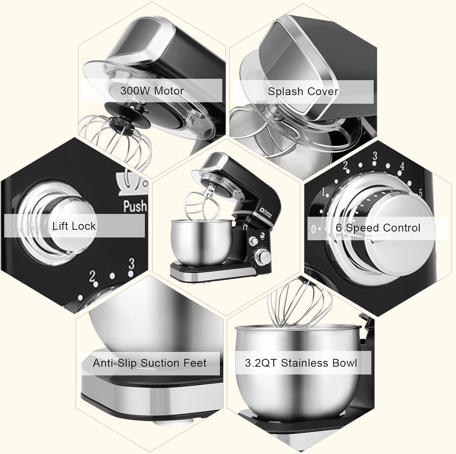 - 3.2Qt Capacity and Tilt Head Design - Our little kitchen mixer equipped with 3.2Qt stainless steel bowl,suitable for new baker,1-2 members family or couples,easy to operate and clean up.Tilt-head design mixer allows access to install or uninstall bowl and accessories easily.And transparent anti-splash lid could prevent the ingredient making a mess.