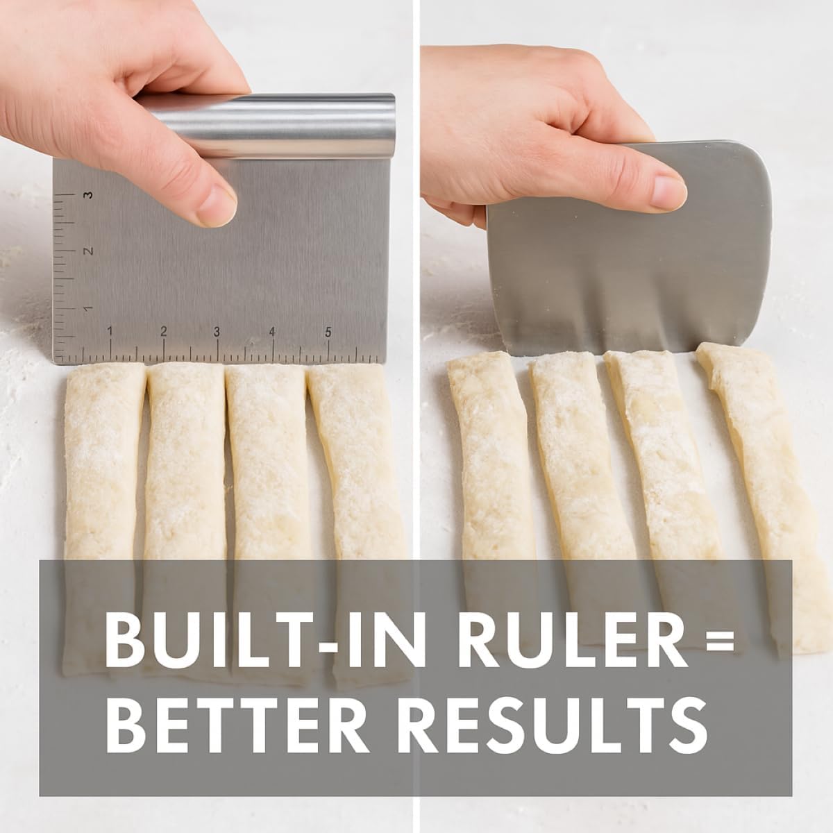 • Clearly etched markings (in 1-inch increments) helps portion dough into right-sized pieces (up to 6-inches); scrape dough from surfaces for less waste