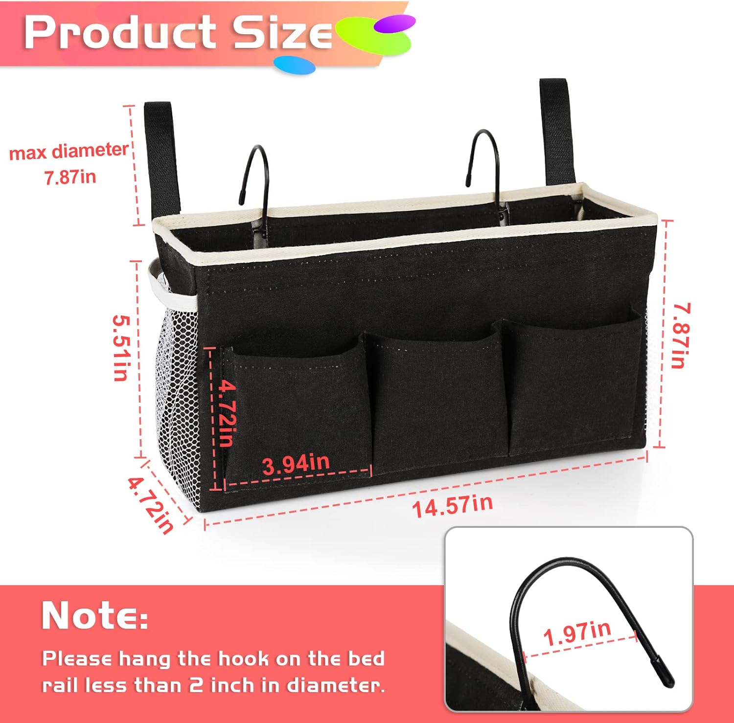 • 【Size Information】The bedside caddy overall size: 14.57x4.72x7.87 inch; Pockets size: 3.94x4.72 inch; Note: Our bedside organizer caddy hanging storage is suitable for dormitory bunk beds with a bed rail diameter less than 1.97 inch.