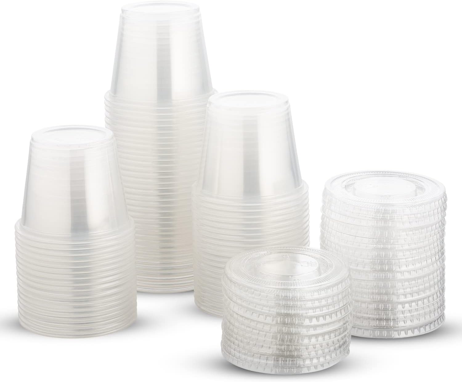 DuraHome Plastic Portion Cups with Lids 4 oz. & 5.5oz. Combo Pack of 150 Leakproof Jello Cup Mini Containers for Salad Dressing Sauce Condiment Snack Souffle and Salsa, Disposable, Interchangeable