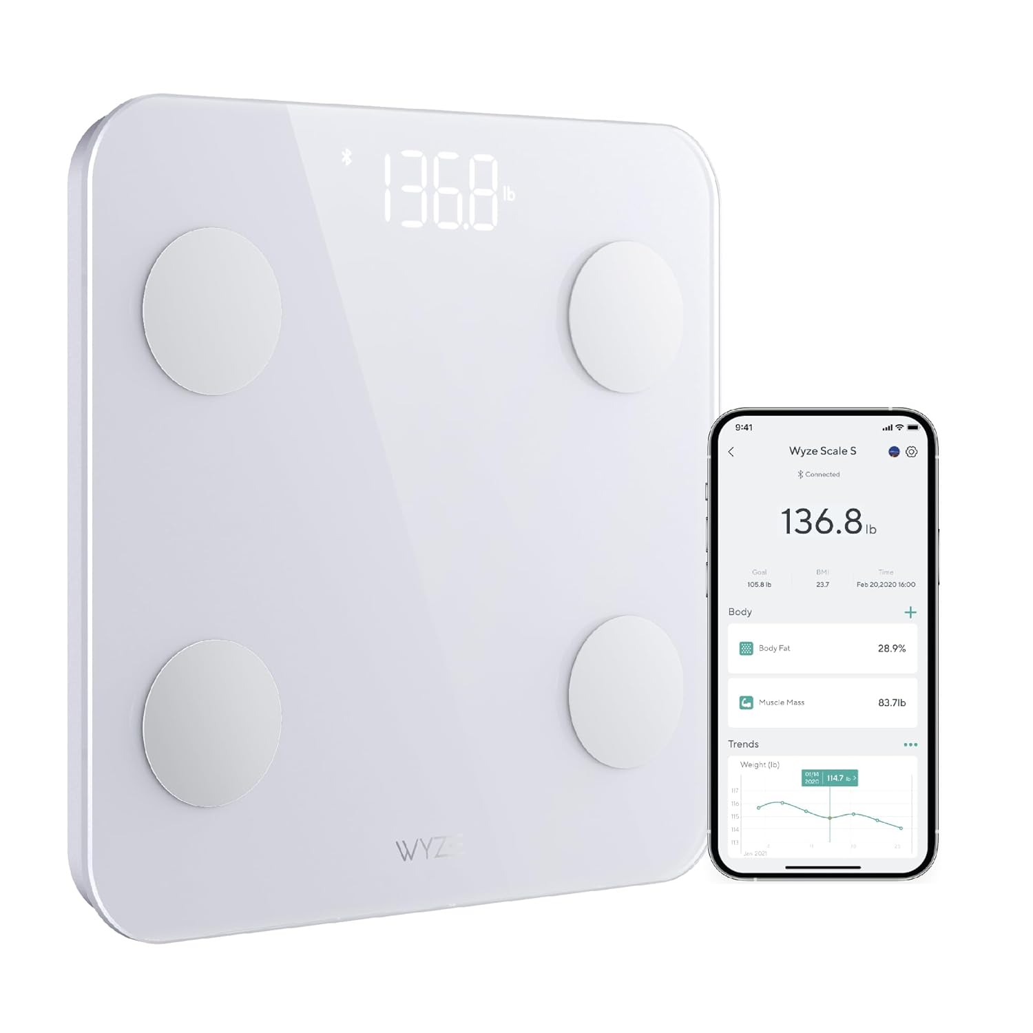 Wyze Scale S, Scale for Body Weight, Digital Bathroom Scale for Body Fat, BMI, Muscle, Heart Rate, Body Composition Analyzer with App, Batteries Included, Bluetooth, 400 lb, White