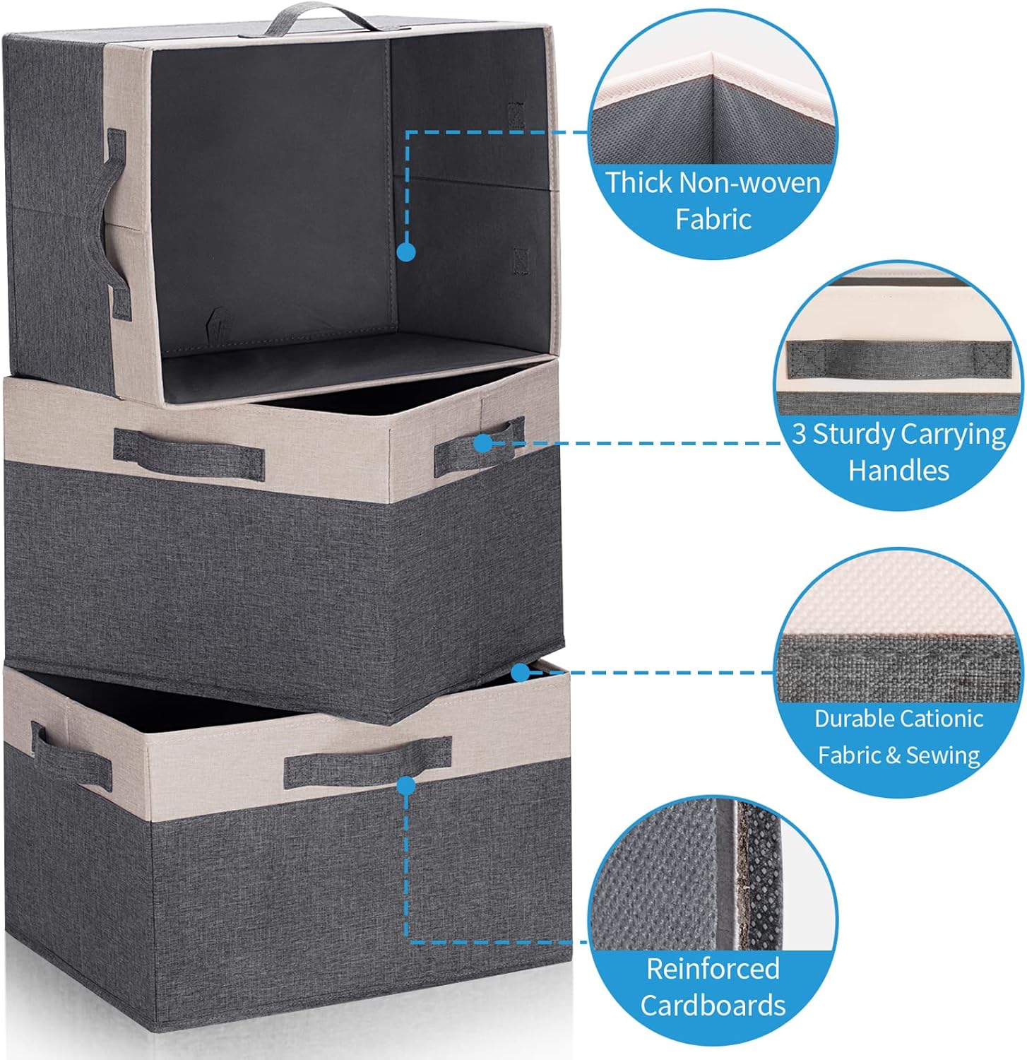 - 【PREMIUM QUALITY】Our closet storage bins are made of tear-resistant, high-quality cationic fabric with odorless, durable, and sturdy properties, which are 100 times stronger than non-woven fabric for durability, so they can be used for long periods of time. The organizer baskets are stitched with 3 handles, reinforced for support heavy loads without ripping