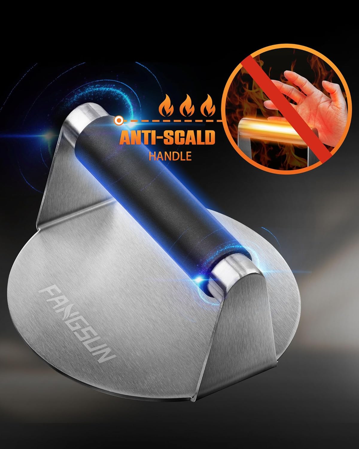 FANGSUN Burger Press with Anti-Scald Handle, 5.8 Inch Stainless Steel Burger Smasher, Round Non-Stick Hamburger Press for Griddle, Griddle Accessories Kit for Flat Grill Cooking, Gift Package