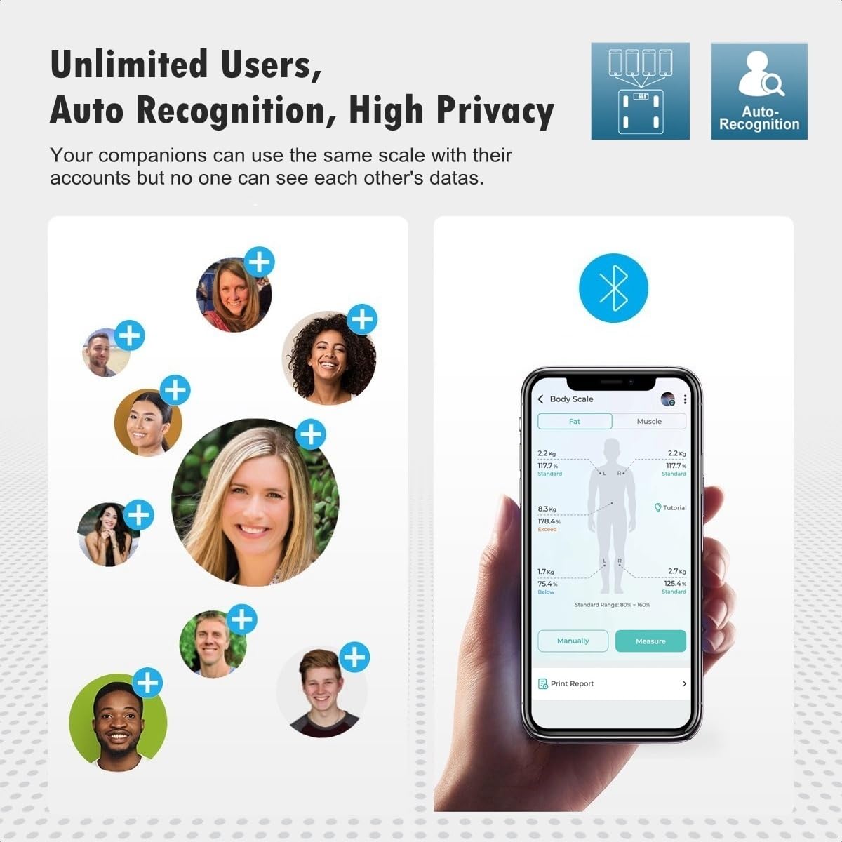 - Support Mulitiple Users: This electric bluetooth smart scale allows your families or friends to share one scale together via their own mobile devices. However your data was stored ONLY in your mobile phone.