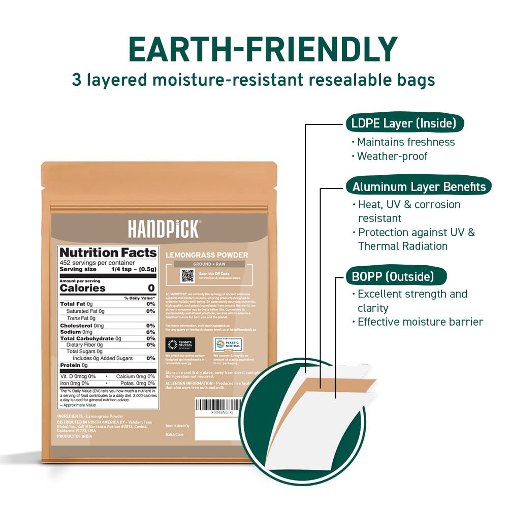 HANDPICK Lemongrass Powder (226g/8oz) Non GMO, Gluten Free, 100% Raw, Sourced from India, For Cooking, Smoothies, Tea, Packed in Resealable Ziplock Pouch