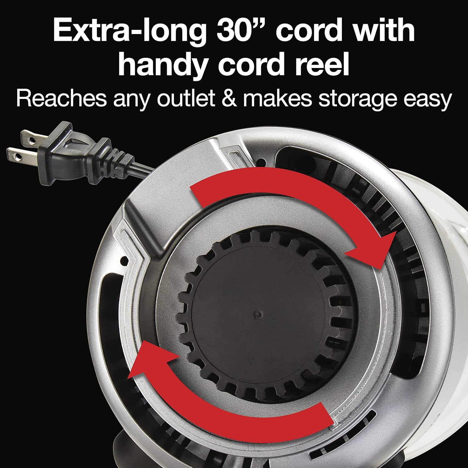 - EXTRA-LONG 30" CORD WITH HANDY CORD REEL. The 30" cord easily reaches any outlet and its handy cord reel makes storage easy. To retract the cord, simply turn the ergonomic handle in either direction to quickly reel it in.