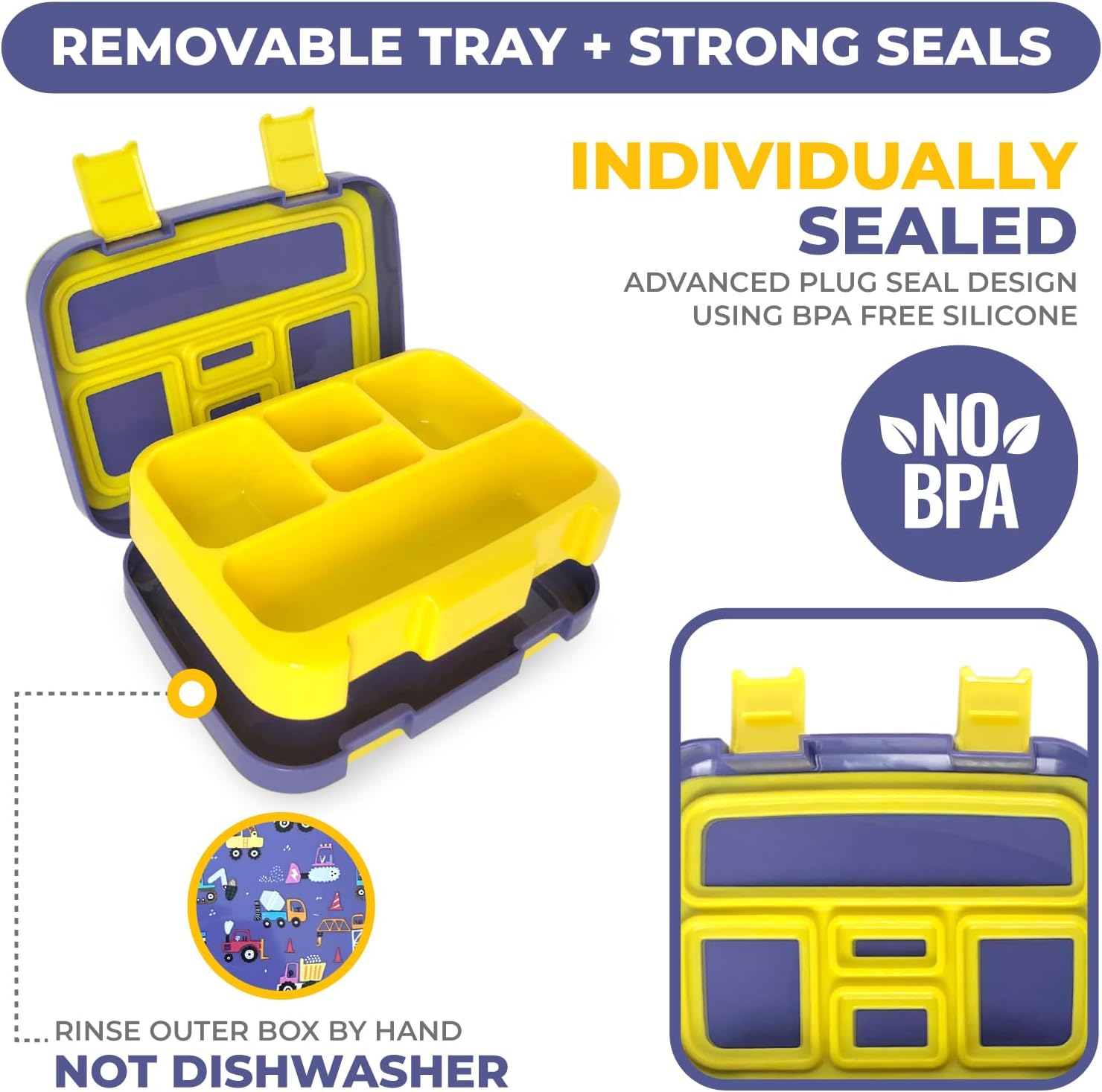 - DURABLE Leak Resistant Container – Along with a secure design, drop-resistant rubberized trim and easy-open latches for small hands these bento boxes for kids lunches feature a removable inner tray that’s microwave and dishwasher safe for versatile food prep and quick cleanup.BPA and phlalate free. WASH OUTER BOX BY HAND to maintain seal shape.