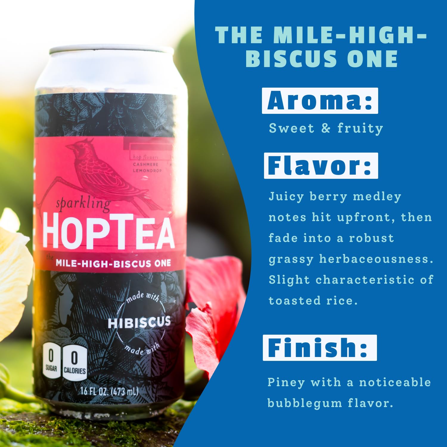 - HIBISCUS + HOPS = TANGY TWIST – Hibiscus petals bring a tangy depth to this sparkling tea, while the hop blend adds soft candied citrus and a delicate herbal finish. Refreshing, but never too fruity or sweet.