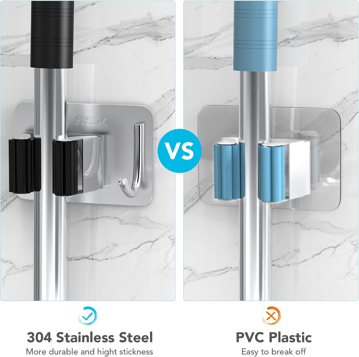 - ✔ Waterproof: HOMEASY self-adhesive broom holder wall mount is made of high quality SUS304 stainless steel, waterproof and rustproof. Triangle-buckle & petal-shaped gear adjust size automatically based on different thickness of the handles to prevent object slipping. Can stand up to 10 KG, more strong and sturdy than plastic holder