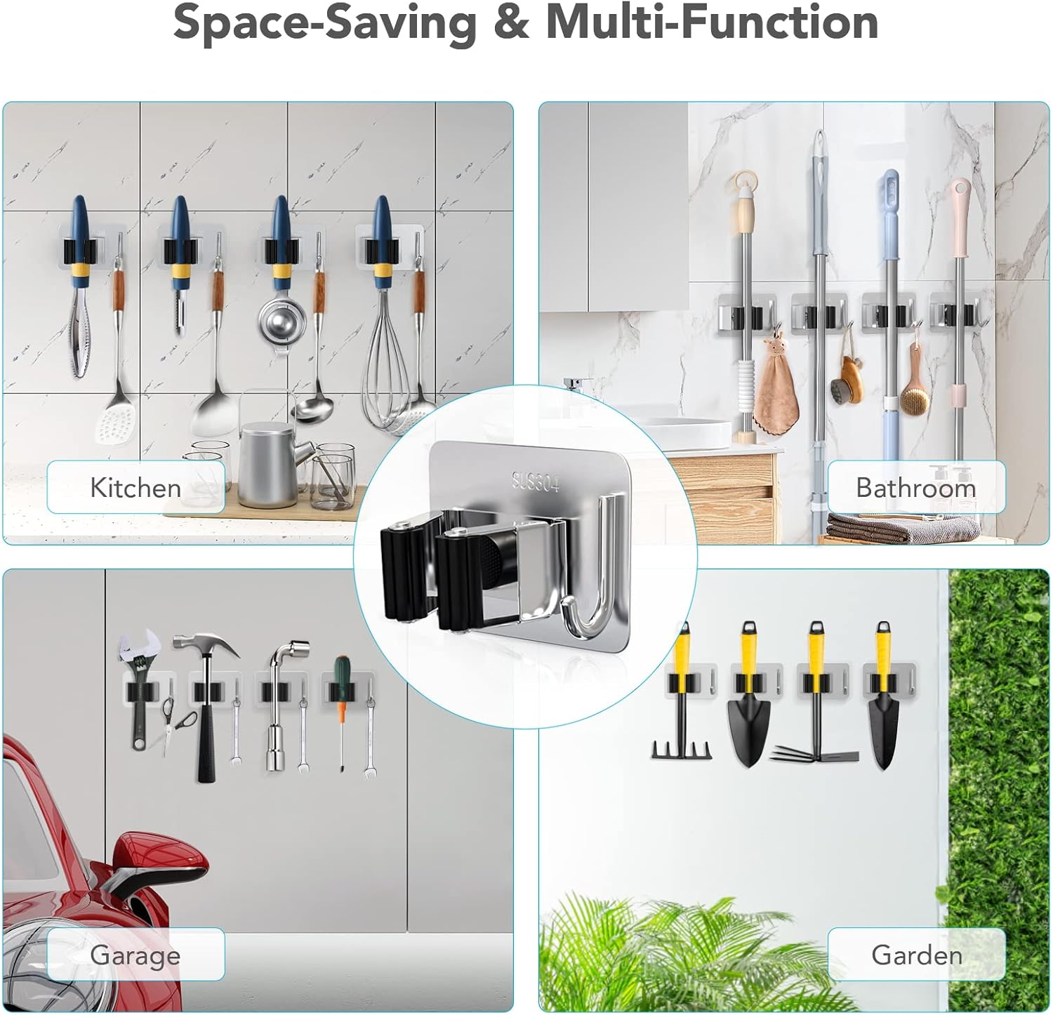 - ✔ Multi-purpose Storage: Self adhesive mop organizer is helpful to organize the mop, broom, umbrella, brush, shovel and other tools, keeping your home clean. The hooks can hang a variety of daily items, improving storage space