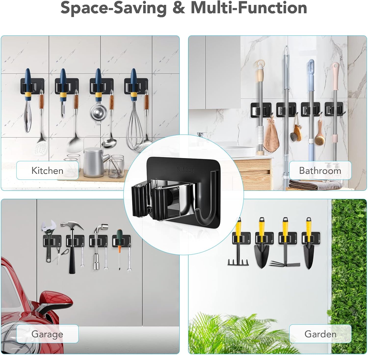 - ✔ Multi-purpose Storage: Self adhesive mop organizer is helpful to organize the mop, broom, umbrella, brush, shovel and other tools, keeping your home clean. The hooks can hang a variety of daily items, improving storage space