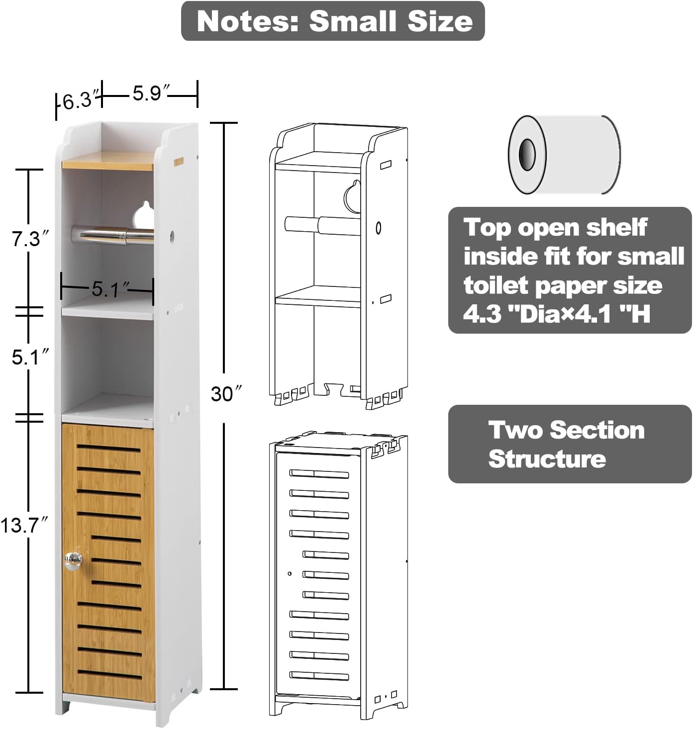 AOJEZOR Toilet Paper Holder Stand: Small Bathroom Storage Cabinet- White&Bamboo