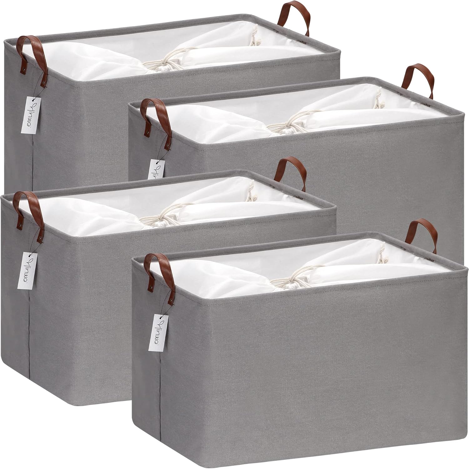 Hinwo 70L Extra Large Storage Bins, 4-Pack Closet Organizers and Storage, Foldable Clothes Storage Baskets with Handles, Containers for Clothing, Blanket, Comforters, Toys, Bedding (Gray)