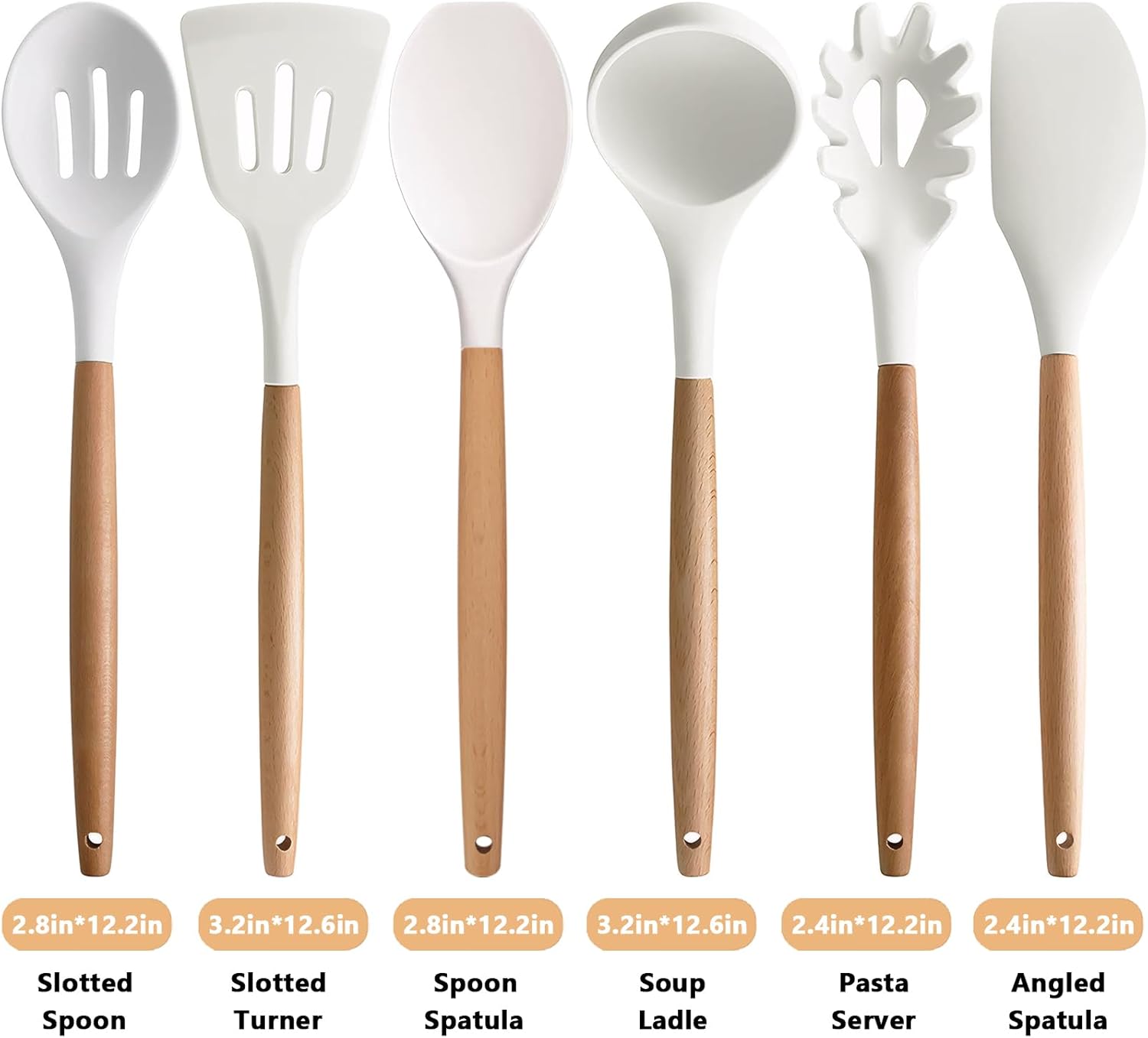 Kitchen Cooking Utensils Set 6Pcs Non-Stick Silicone Kitchen Utensils Spatula Spoon Turner Ladle Pasta Server, Heat Resistant Wooden Handle Silicone Cooking Gadgets Sets for Cookware & Baking
