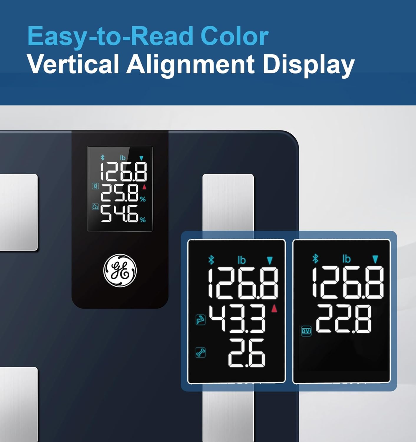 - Full Body Analysis: The GE Fit Plus Smart Body Fat Scale accurately analyzes and tracks nine key fitness metrics. These include body weight, body fat percentage, muscle mass, body water, visceral fat, fat-free body weight, BMI, BMR, and bone mass directly to your phone via Bluetooth. This scale will help you reach your fitness goals even faster!