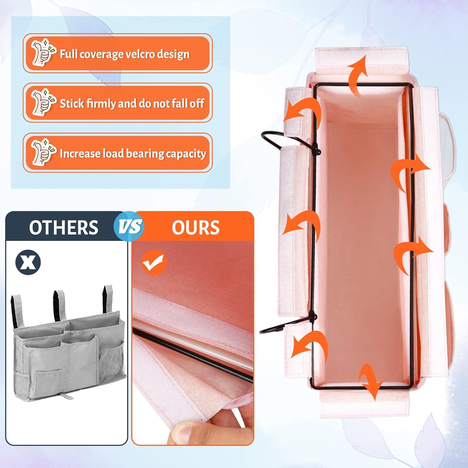 • 【Full Coverage Velcro & Cardboard Support】The metal frame on the top and inside of our bed organizer is fully glued and covered, and the front, back and bottom are equipped with removable rigid PP cardboard, which maintains a stable structure and shape, prevents tipping, and is more stable and enduring.