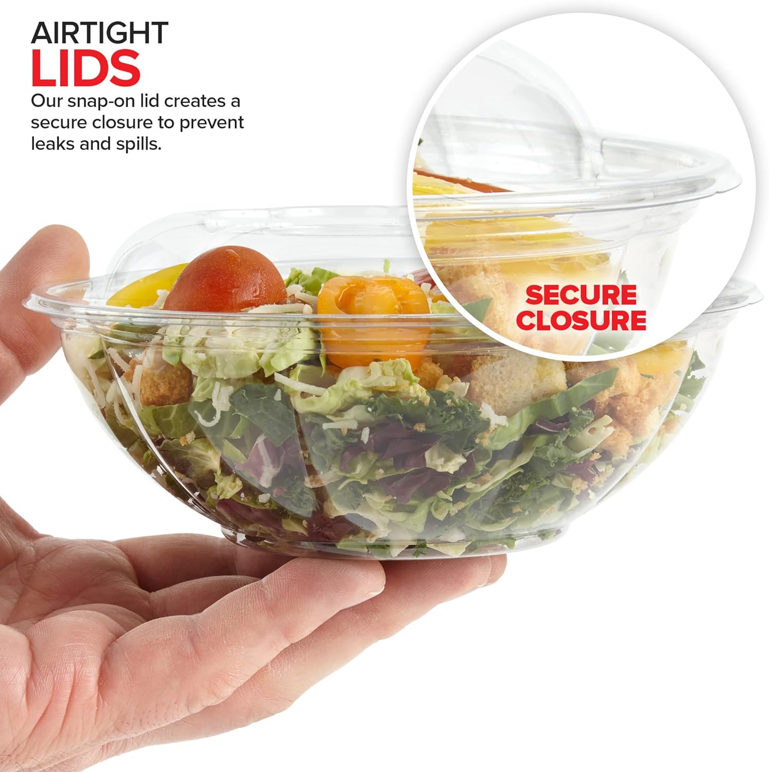 - Airtight Lids: Our snap-on lid creates a secure closure to prevent leaks and spills. This also helps keep your salads fresh and delicious!
