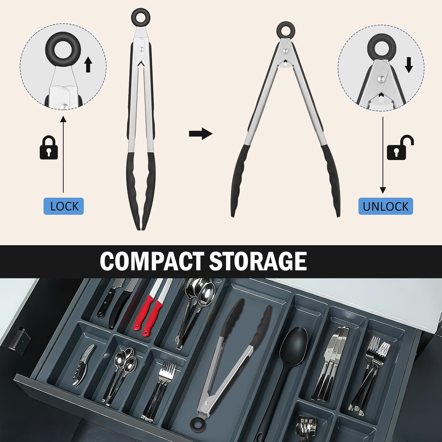 • Locking Mechanism: This Cooking tongs have a ring pull locking mechanism, pull the ring for lock to save space, and push for open can be one-hand opration. Also include a hanging ring for easy hang and storage.