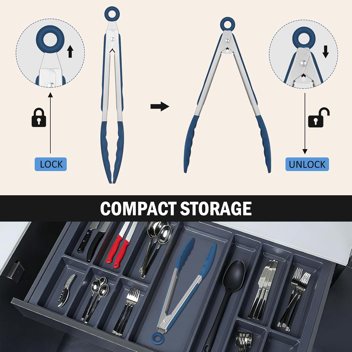 • Locking Mechanism: This Cooking tongs have a ring pull locking mechanism, pull the ring for lock to save space, and push for open can be one-hand opration. Also include a hanging ring for easy hang and storage.
