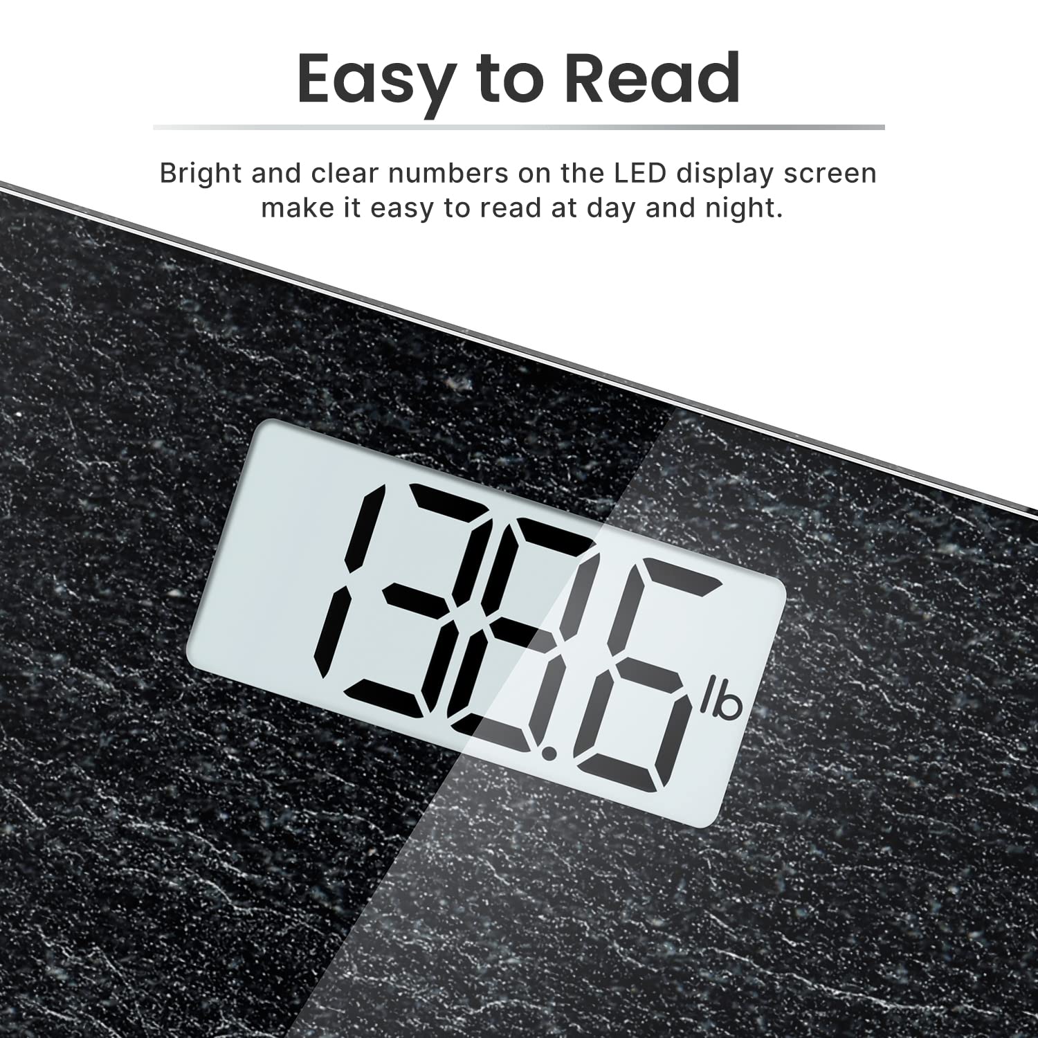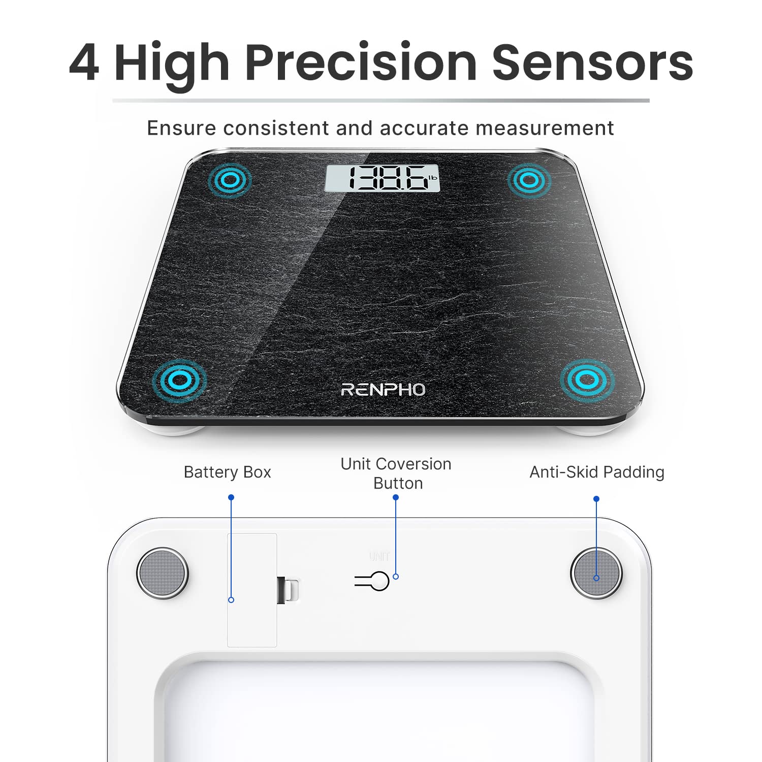 - Always Accurate: Equipped with 4 high-precision sensors, the digital bathroom scale instantly delivers precise weight readings with a capacity of 400lb (180kg) in 0.1lb (0.05kg) increments, enabling you to accurately track even small changes in your weight.
