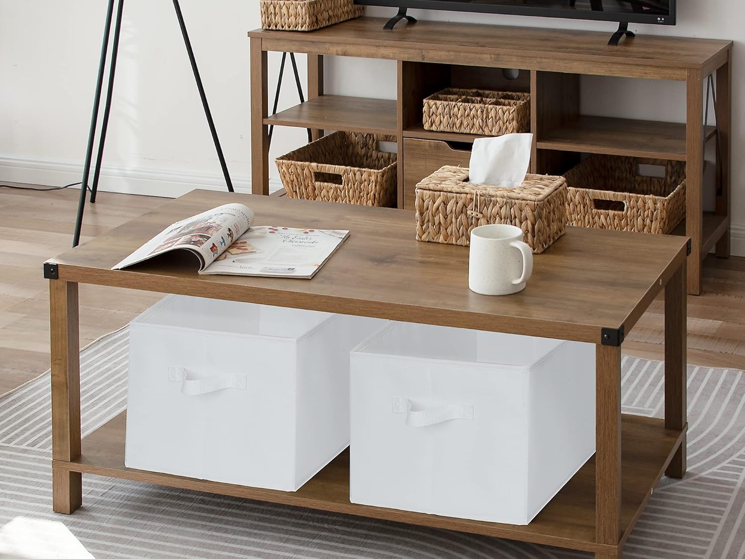 - The natural fiber and the inserted heavy-duty boards allow the storage bins to hold a weight of up to 30 pounds.