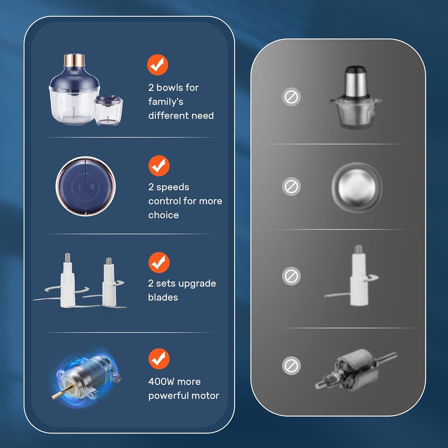Bear Food Processor, Electric Food Chopper with 2 Glass Bowls (8 Cup+2.5 Cup), 400W Power Grinder with 2 Sets Stainless Steel Blades, 2 Speed for Meat, Vegetables, and Baby Food