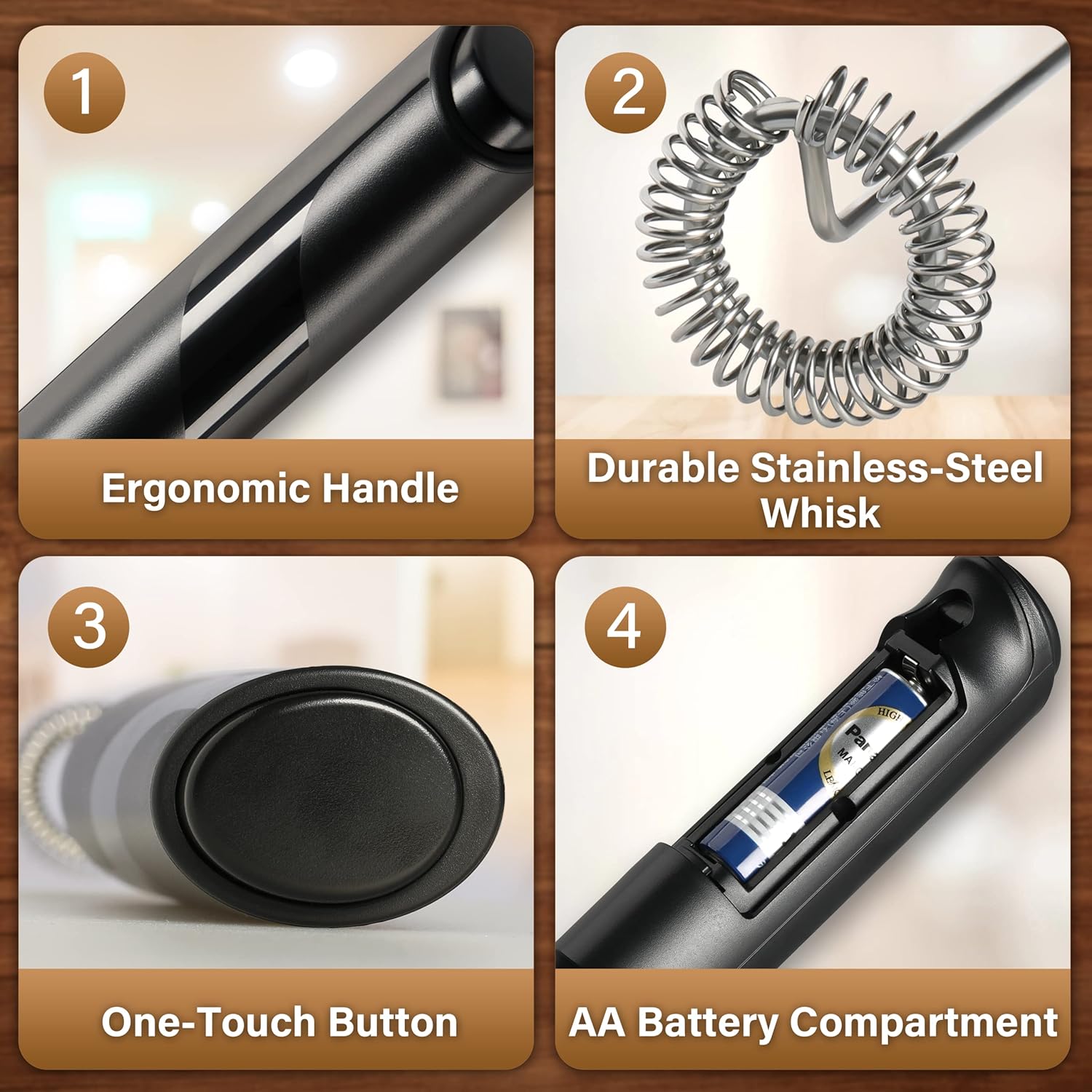 YSSOA Electric Milk Frother Handheld with Stainless Steel Stand Battery Operated Whisk Drink Mixer for Coffee, Frappe, Latte, Matcha, Black (Handheld, Black)