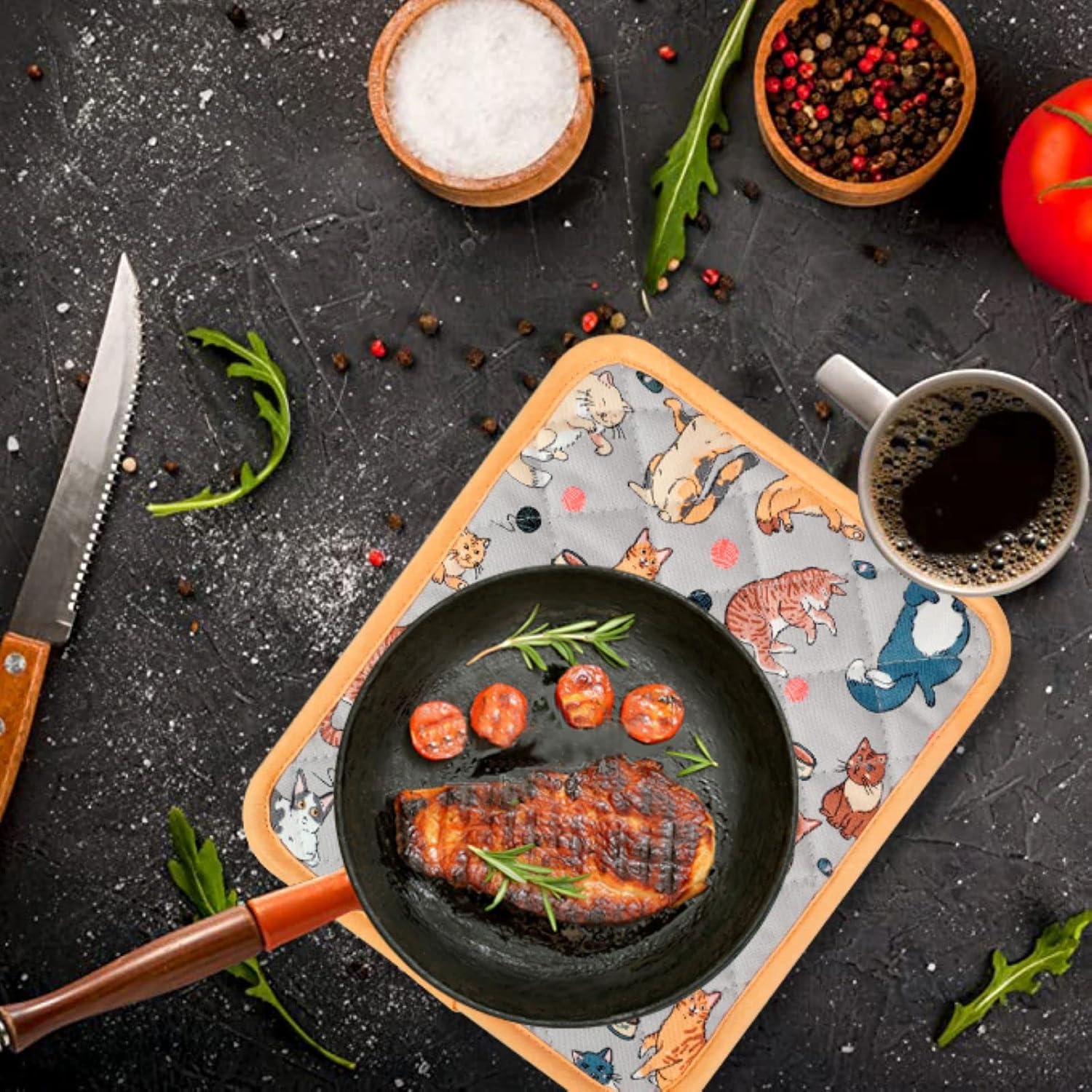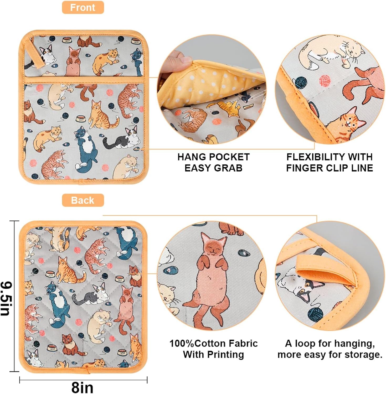 Pot Holders Set of 2 Heat Resistant 480℉ Kitchen 100% Cotton Comfortable Lining Printing Fox Flower Women Men Home Cooking Baking Microwave BBQ Gift (Cat potholder)