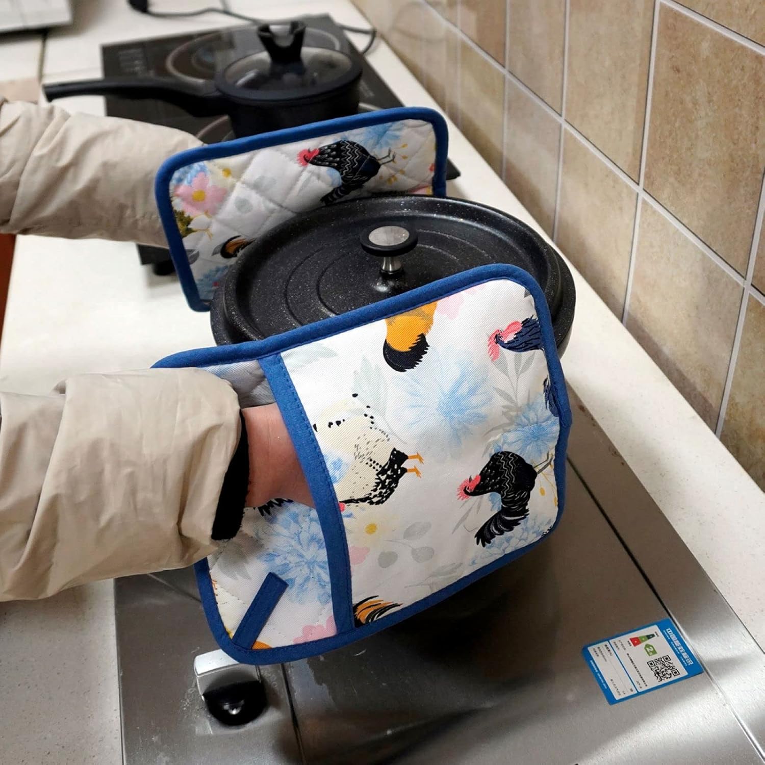 Pot Holders Set of 2 Heat Resistant 480℉ Kitchen 100% Cotton Comfortable Lining Printing Fox Flower Women Men Home Cooking Baking Microwave BBQ Gift (Rooster potholder)