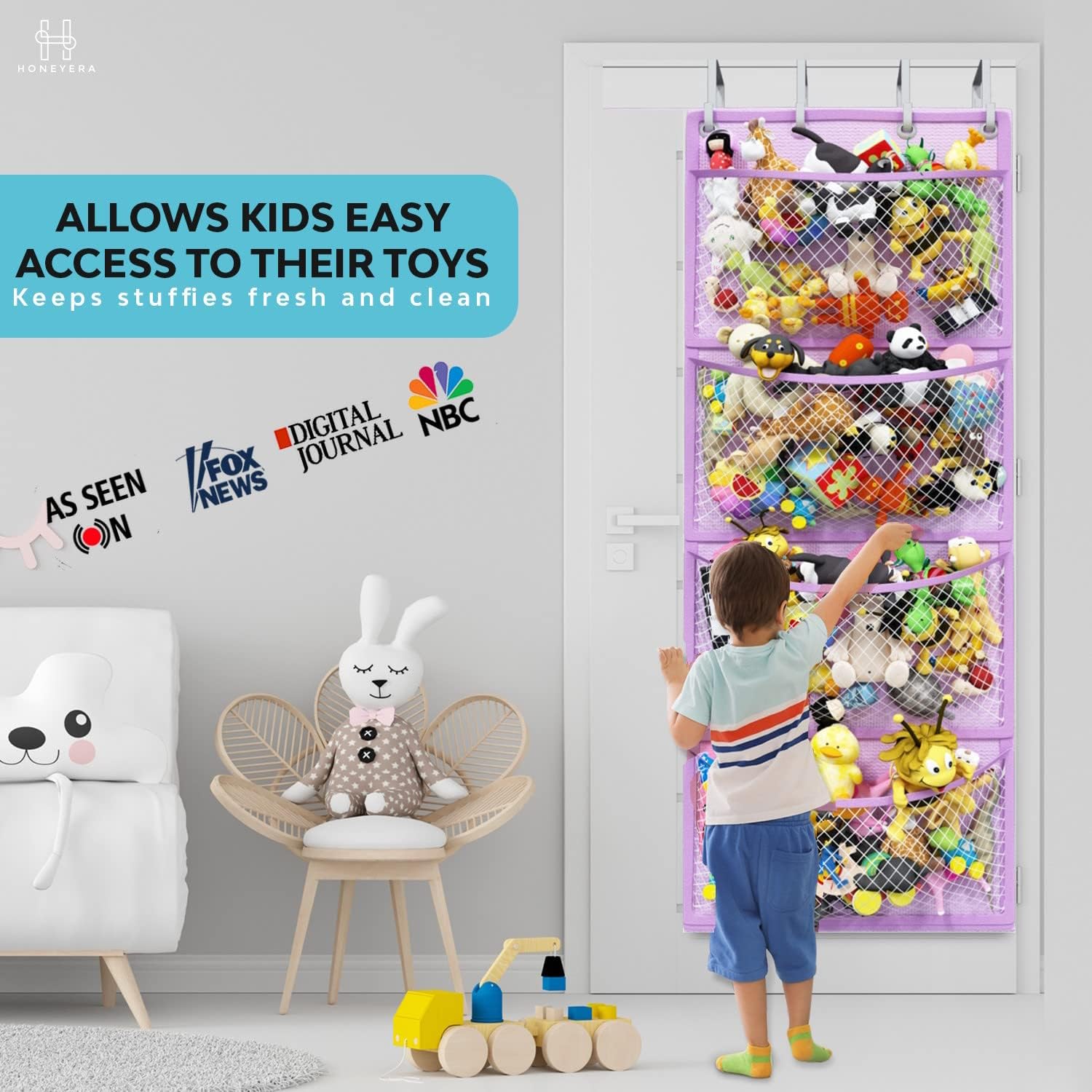 - 🧸 CONVENIENT STUFFED ANIMAL STORAGE - The perfect stuffed animal organizer to easily store and organize your favorite toys in our over the door storage unit. Easy to setup, durable, and allows kids convenient access to their toys. Equipped with breathable mesh pockets keeping your stuffies fresh and clean