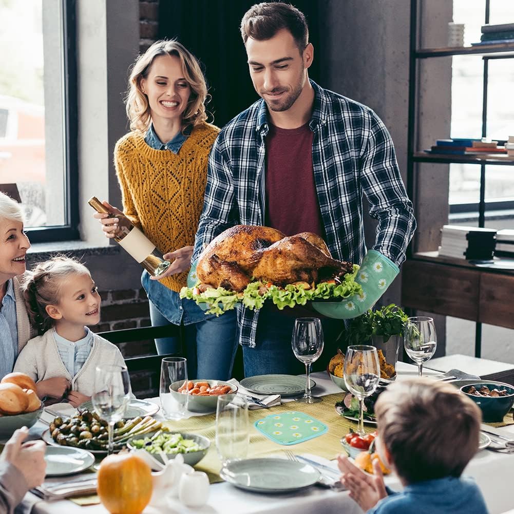 AUAUY Oven Mitts and Potholders, BBQ Gloves Heat Resistant, 1 Pair Oven Mitts and 2 Pot Holders, Cotton Non-Slip Cooking Gloves Home Essentials for Cooking Baking Kitchen Microwave Pizza (Daisy-Green)