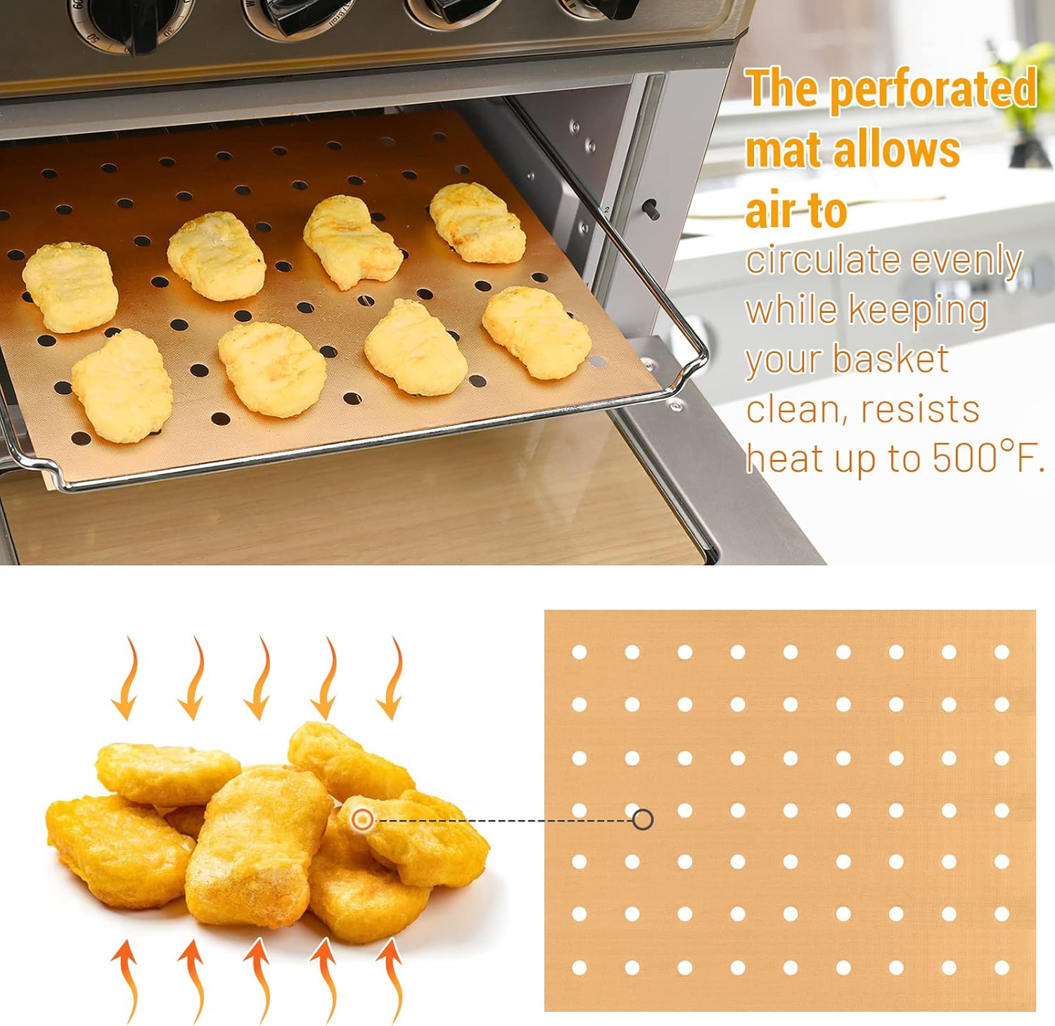 - RICH STYLES: The perforated copper mat allows air to circulate evenly that can make the food get the heat in all directions while keeping your basket clean. The black Solid mat can be installed at the bottom of the electric oven, stay clean and free of dirt, grime and build-up or used as oven liners, pan liners, baking/cooking sheets and grill mats
