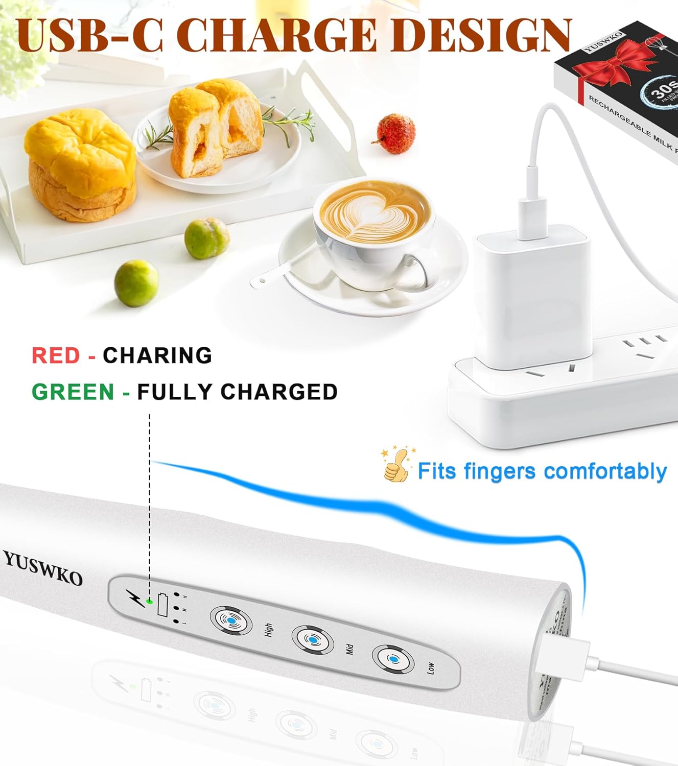 • 🎀【USB-C Rechargeable Milk Frother】This electric milk frother is powered by a built-in 1200mAh rechargeable battery, no need to replace any batteries, environmentally friendly and durable. Compared with the traditional Micro USB charging port, the USB-C charging port design makes it more compatible and faster charging. The charging indicator light is red when charging, and green when fully charged.