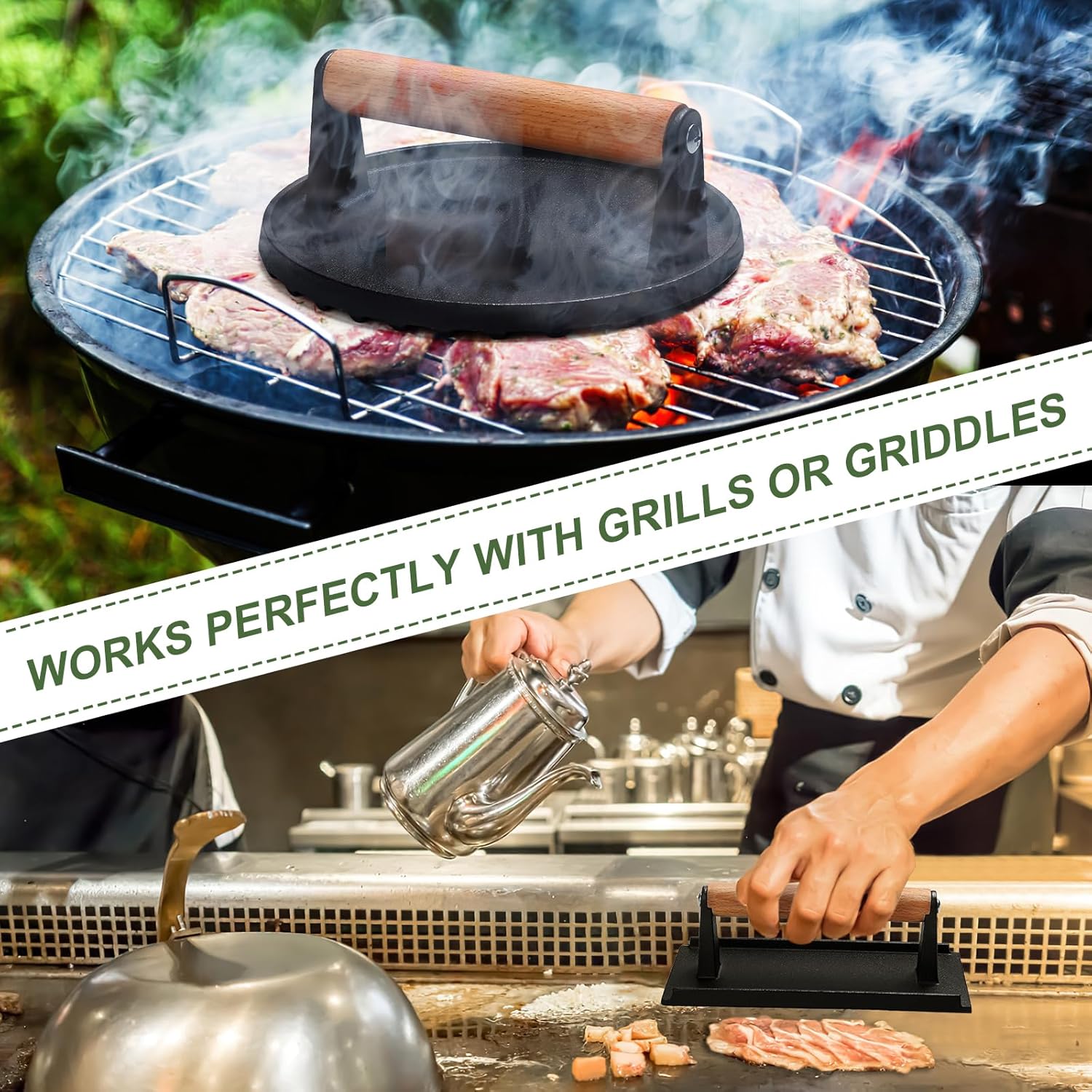 EWFEN Burger Press, 7" Round & 8.2"X4.3" Rectangle Heavy-Duty Cast Iron Smash Bacon Press Meat Steak with Wood Handle for Griddle, Sandwich, Nonstick Pan