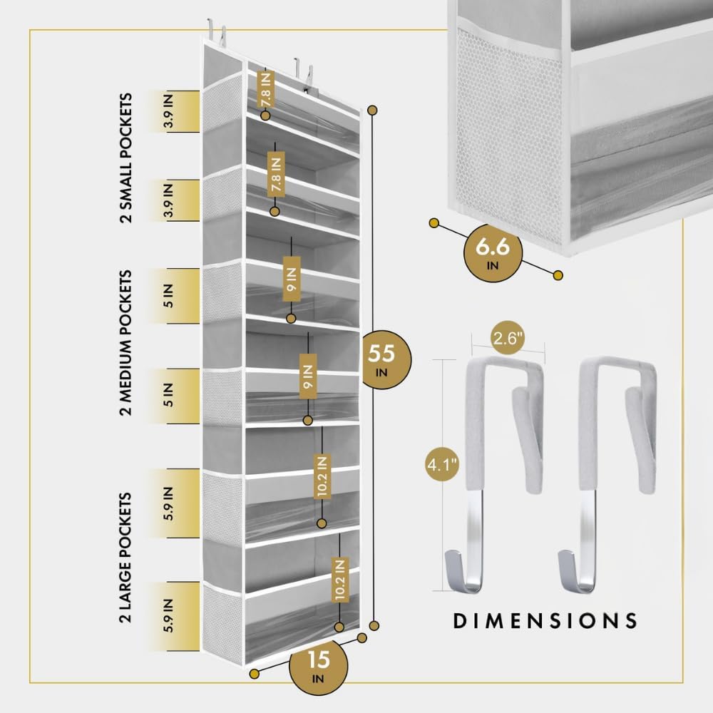 - 🏡 6 Multisized Front Pockets: Unlike other over the door organizer that only comes with 4-5 pockets with one sized depth, we upgraded and improved our hanging door organizer to cater all your door storage needs. Our over the door storage organizer comes with 6 pockets with 3 different sizes and depth to fit all kinds of items you need to store. The two top pockets of our door organizers and storage are specifically designed to be shallower so that the items stored can be easily reached.