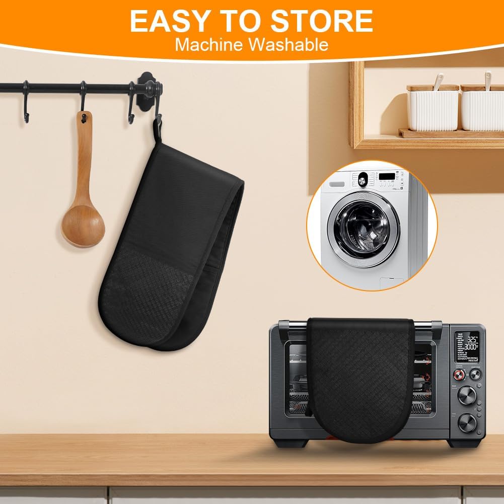 - 😄【UNIQUE DESIGN】Baking Mitts feature a modern dual glove integrated design with a wide joint to prevent body contact with heat sources and prevent gloves from being lost. The kitchen black cotton oven mitts are equipped with ropes, which can be easily put away and hung on the hanging rings when not in use, saving space and making the kitchen look cleaner