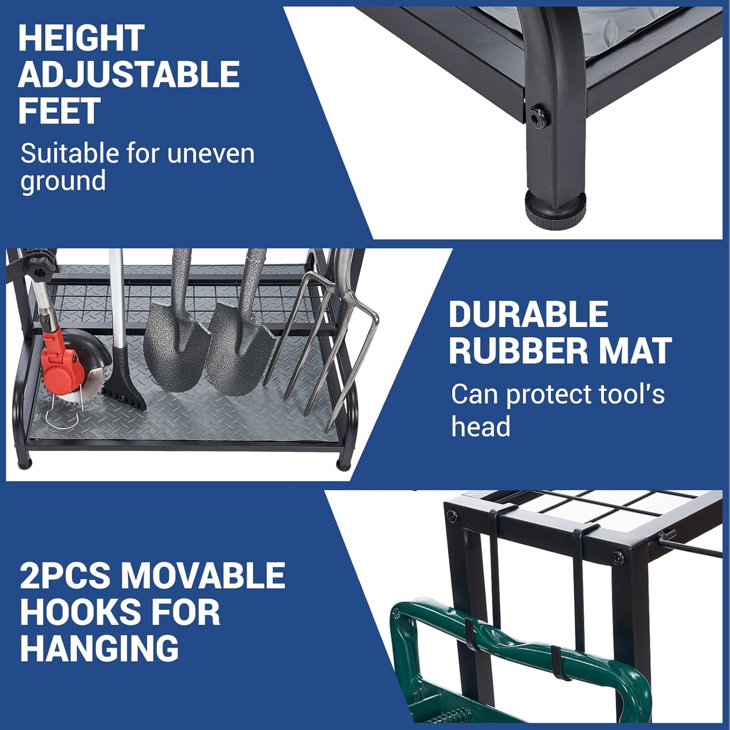 - NEW DESIGN GARAGE ORGANIZATION: 10 G-hooks allows for electric tools like string trimmer and some tools with D-grip handle. In addition, there are 39 square holes, 2 movable hooks, and 4 fixed hooks. It can accommodate a wide range of tools for you. Height-adjustable feet suitable for uneven ground, durable rubber mat can protect your power garden tool 's head