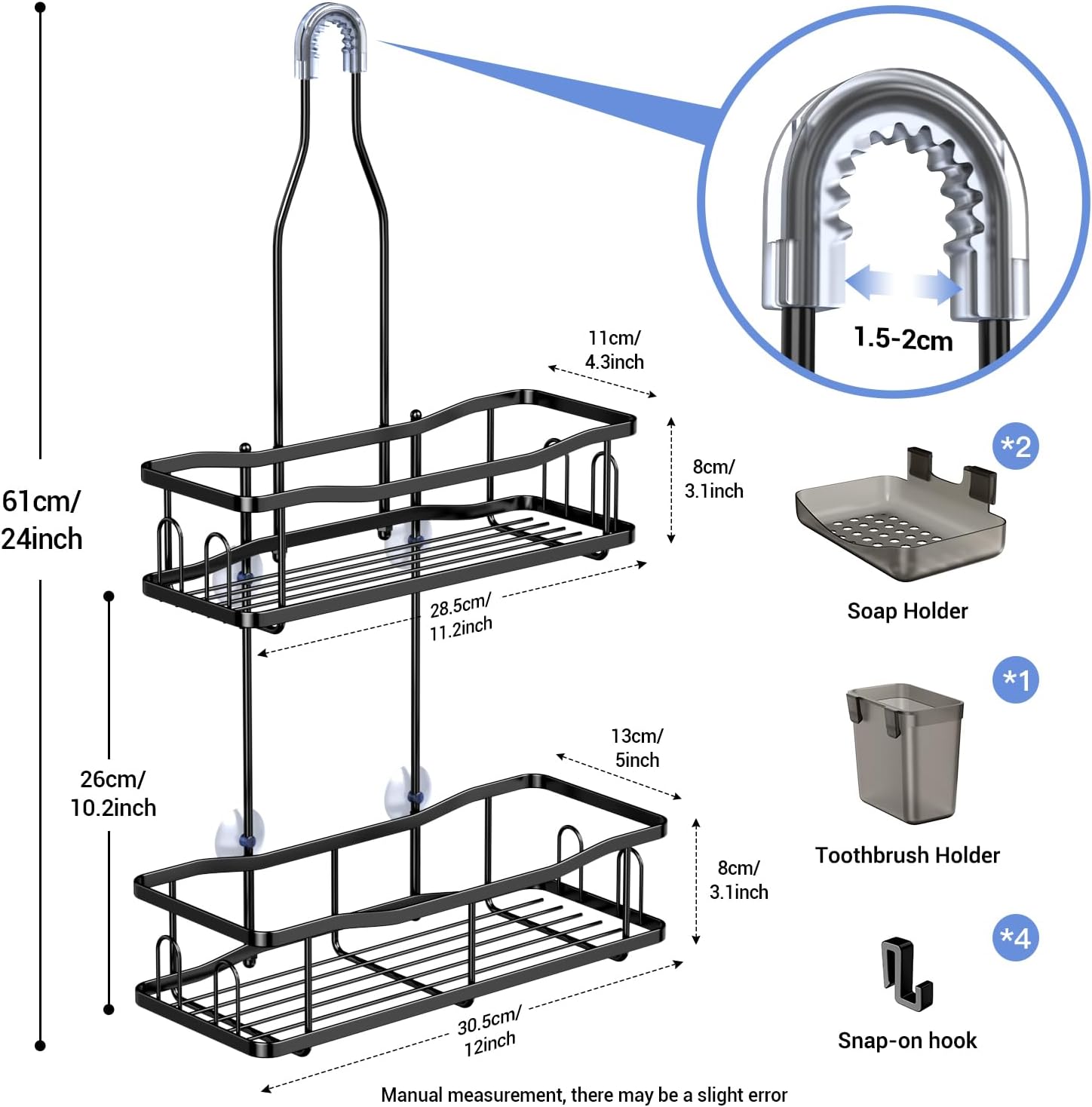 - LARGE CAPACITY WITH STRONG LOAD-BEARING - The bathroom organizer (13x5x25 inches) with 2 tier basket, including 8 hooks on the side, 4 removable hooks, 2 soap dishes and a razor holder, can hold up to 40lbs of toiletries. It maximizes the use of space in your bathroom, inside shower stall or bath tub. You can place shampoo gel, conditioner, body wash, bar soap and other shower toiletry stuff, it can meet almost all your shower storage needs and keep your toiletries organized.