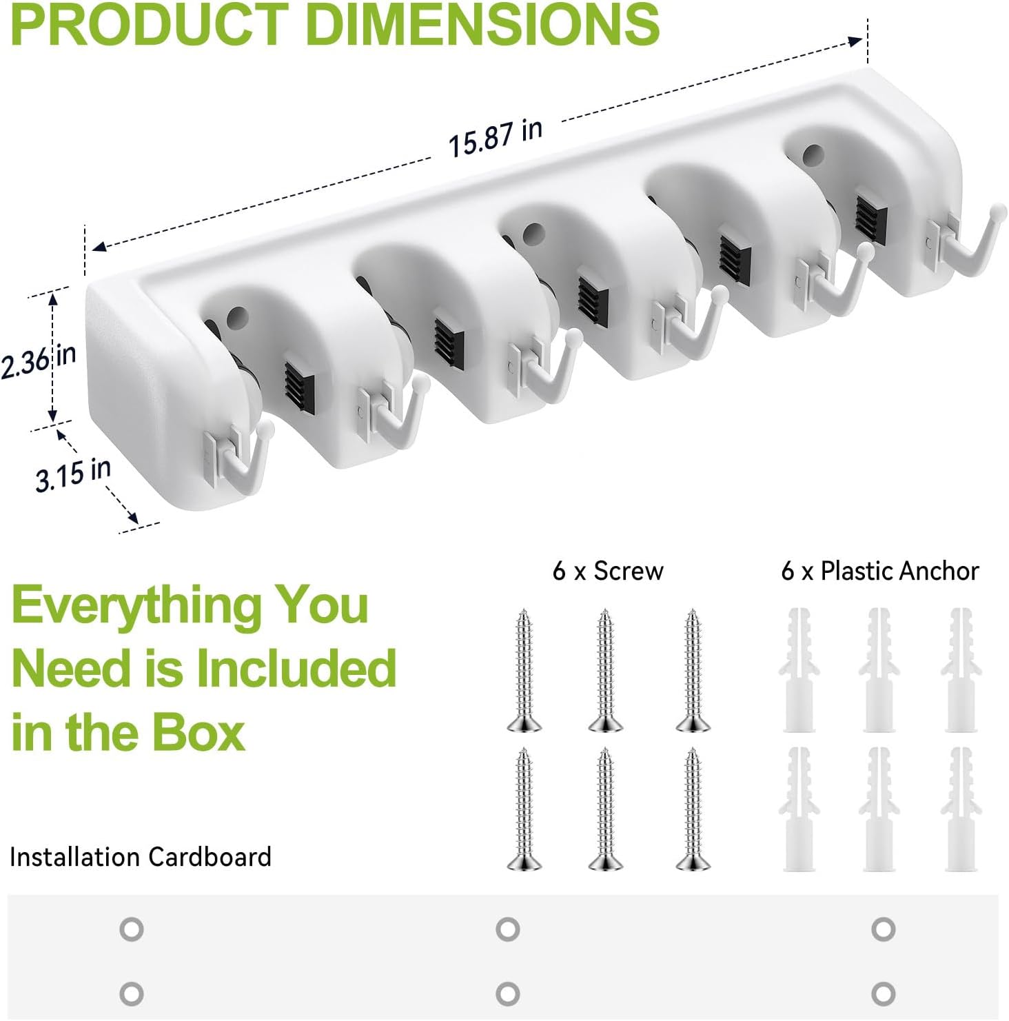 - Easy Installation in Minutes - Included with wall mounted broom holders are all the stainless steel screws and anchors, along with clear step-by-step instructions that allow even the clumsiest of us can install broom and mop organizer wall hanging easily in just minutes!