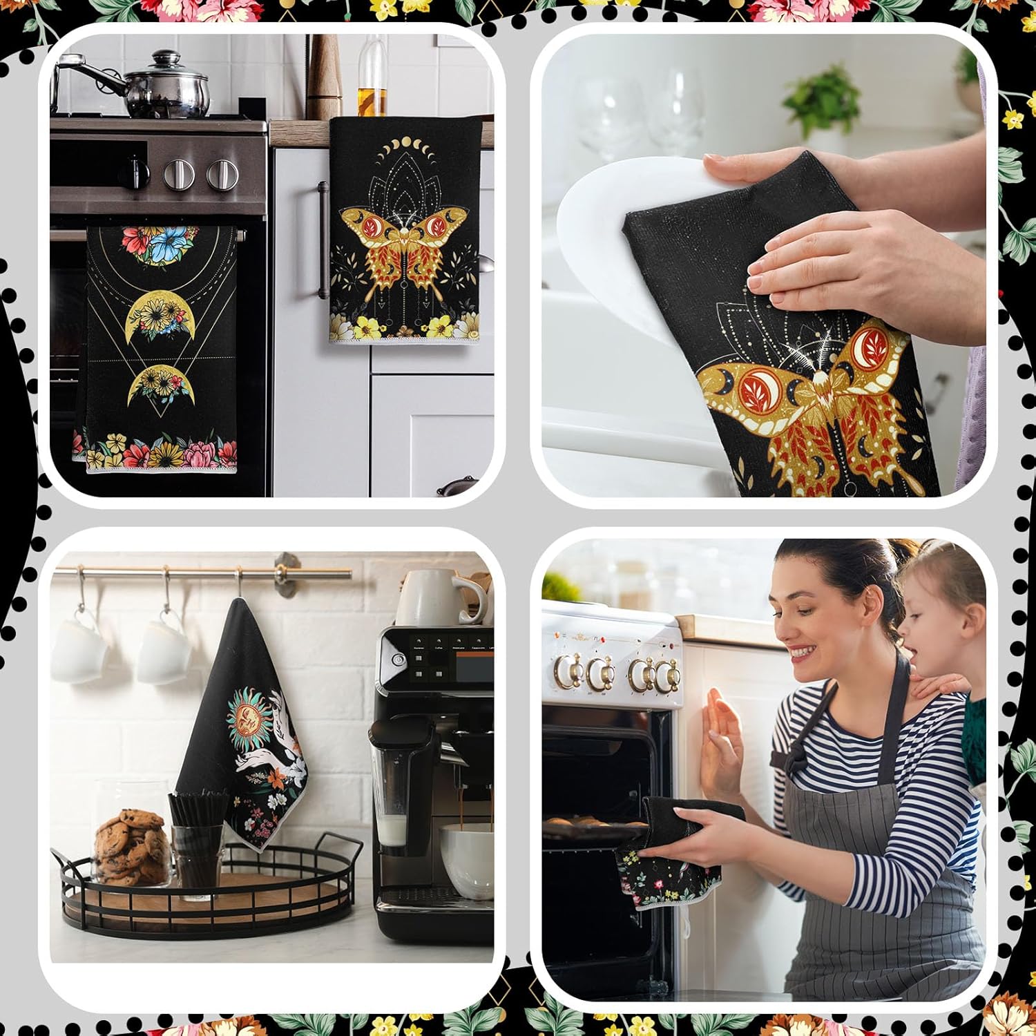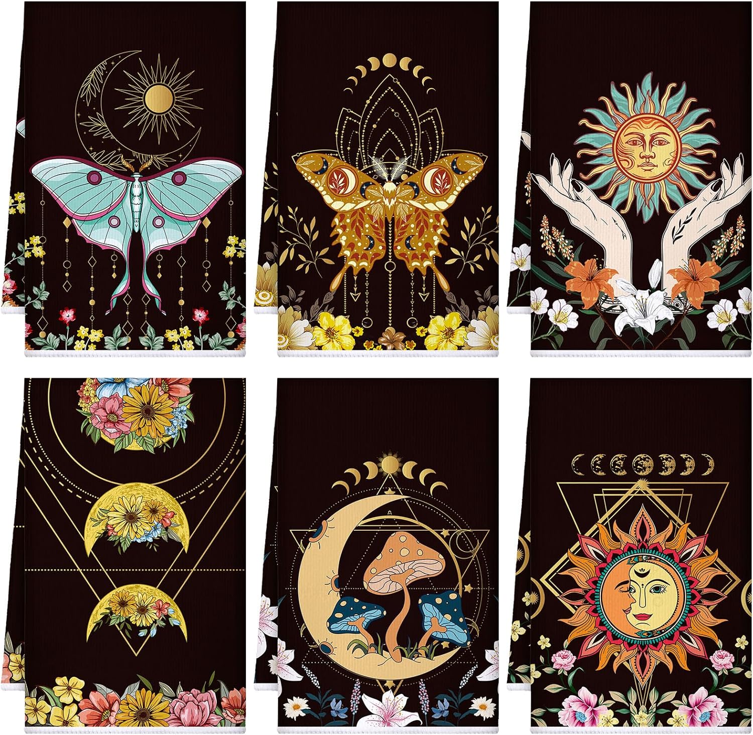 Boyiee Set of 6 Witchy Kitchen Towels Boho Tea Towels Absorbent Mushroom Floral Dish Towels 24 x 16'' Gothic Dish Towels Sun Moon Star Butterfly Hand Towels Gifts for Farmhouse Kitchen Bathroom