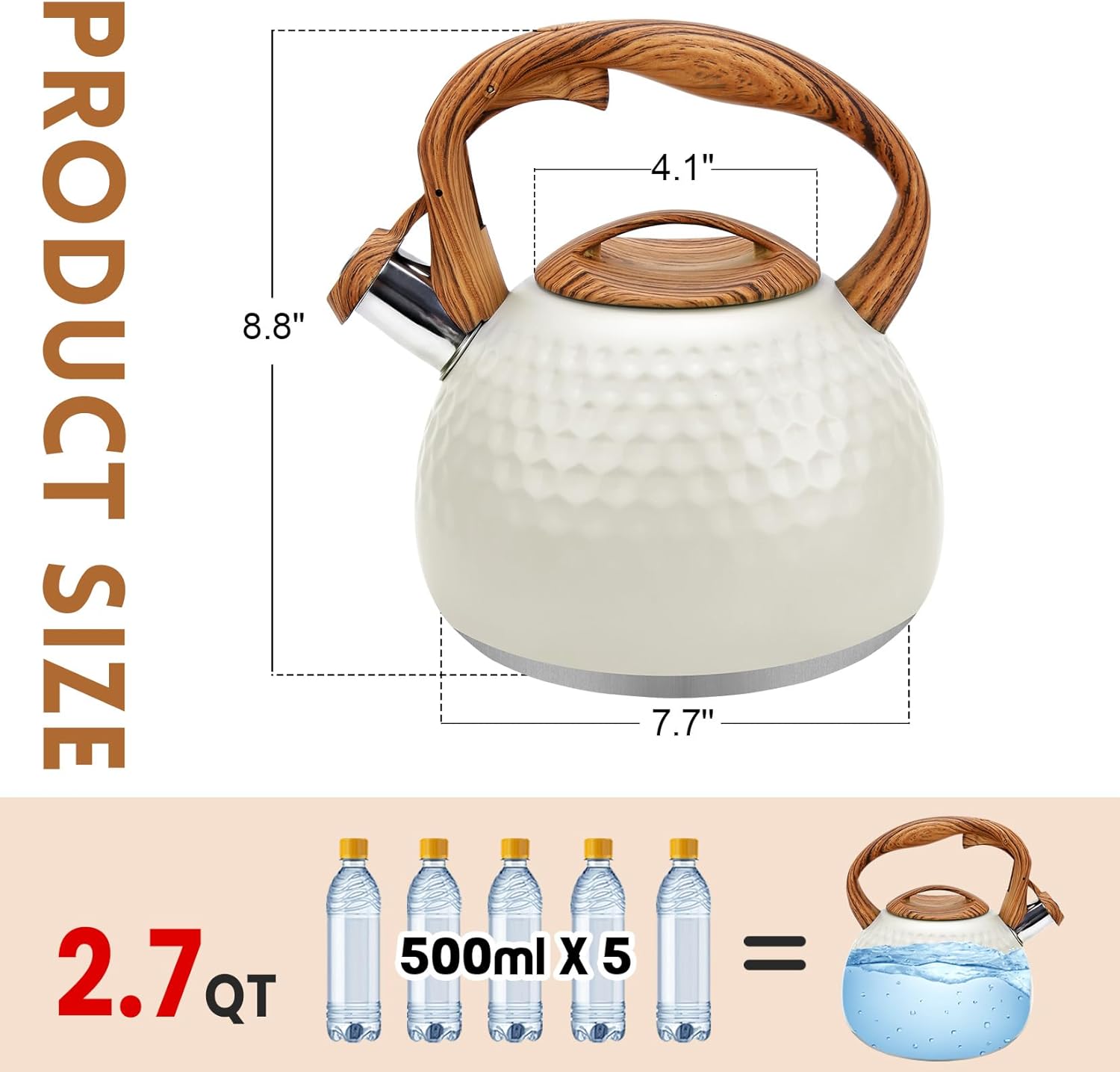 GGC Tea Kettle for Stove Top, Loud Whistling Kettle for Boiling Water Coffee or Milk, 3.1 Quart 3L Heavy Stainless Steel White Kettles with Wood Pattern Handle, Unique Button Control Kettle Outle