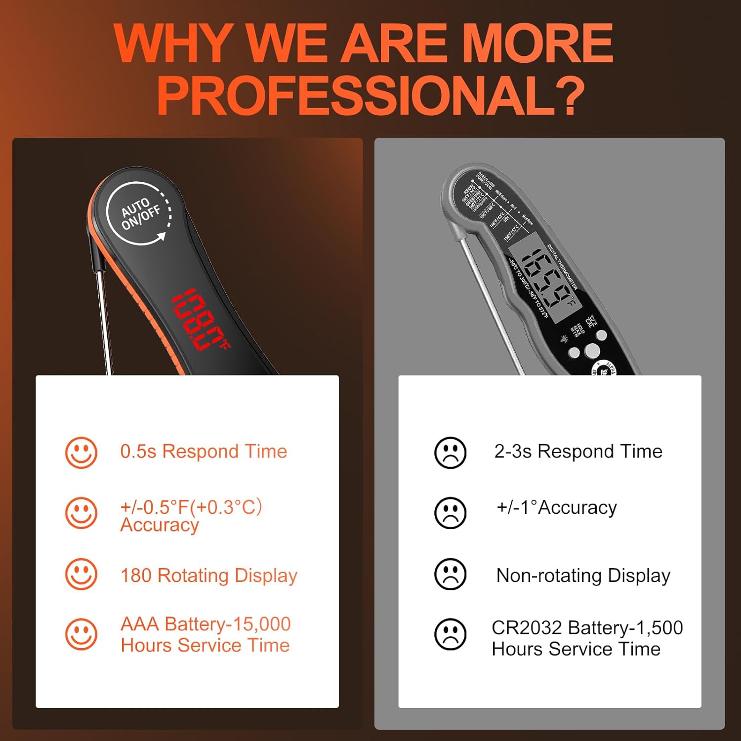 - Professional Accuracy ±0.5°F. This digital meat thermometer has superior accuracy specifications of ±0.5°F (or ±0.3°C). This high accuracy ensures that you can accurately control the temperature of your food to avoid overcooking. It is also specially calibrated to ensure accuracy when measuring meat temperatures