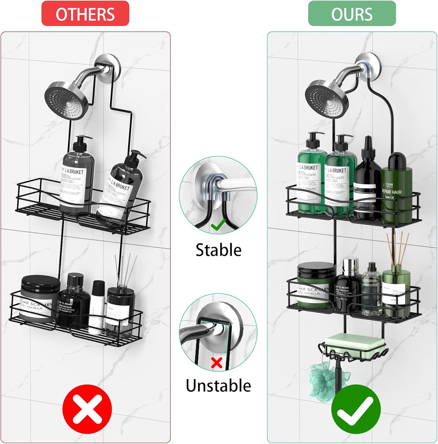 - MULTI-FUNCTIONAL DESIGN: the height and spacing of the shower organizer hanging adapt to different sizes of bottles, making it easy for you to flexibly place items according to your needs; whether it's shampoo, conditioner, or soap, shower accessories can be easily stored; practical hooks are designed to make it easy for you to hang razors, loofahs, towels, etc. , to meet all of your shower storage needs.