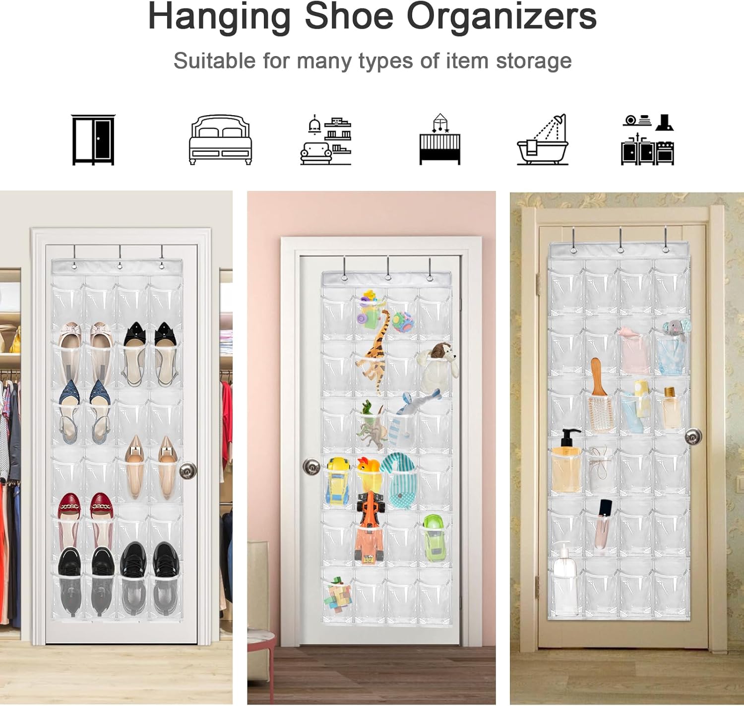 • 𝐒𝐩𝐚𝐜𝐞 𝐒𝐚𝐯𝐞𝐫: You can toss out your smelly and space-holding shoe rack now and get a new crystal clear shoe organizer behind the door. Our foldable organizer is perfect for dorm room or small apartments, it will hold up to 12 pairs of shoes with 24 pockets, or any other small personal items as well. Easy hanging on and moving out, simply take the organizer off and fold into a smaller piece for easy storage