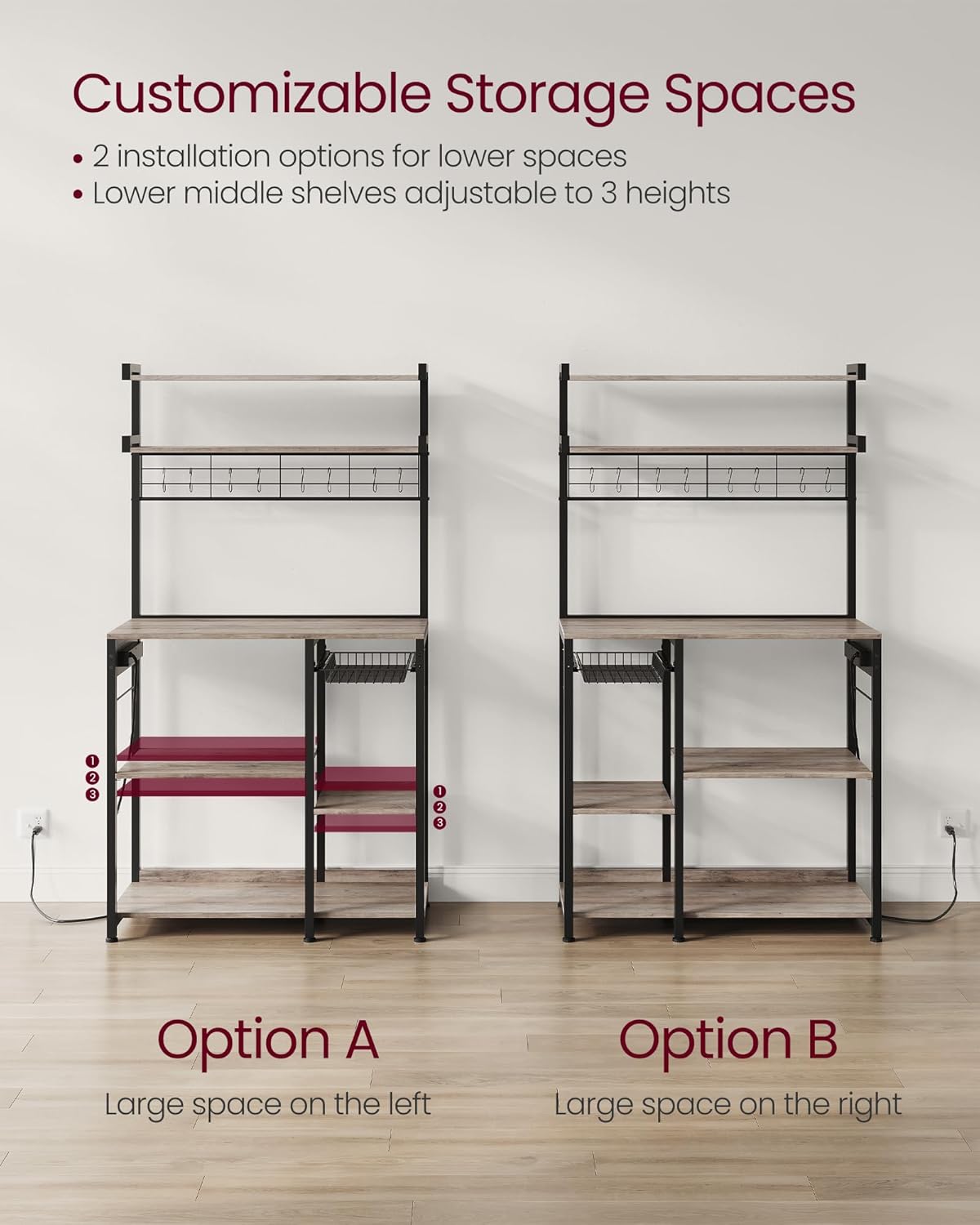 VASAGLE Bakers Rack with Power Outlet, 35.4 Inches Microwave Stand, Coffee Bar, 4 AC Outlets, with Adjustable Shelves, 8 S-Hooks, Basket, Spice Racks, Heather Greige and Ink Black UKKS031K02