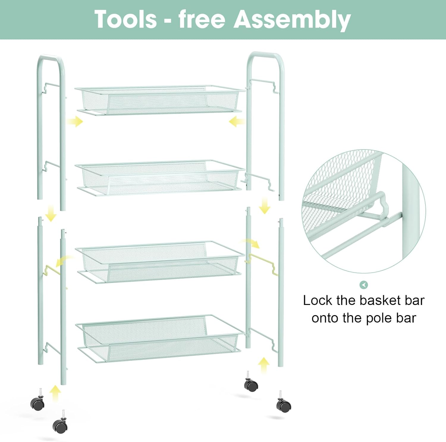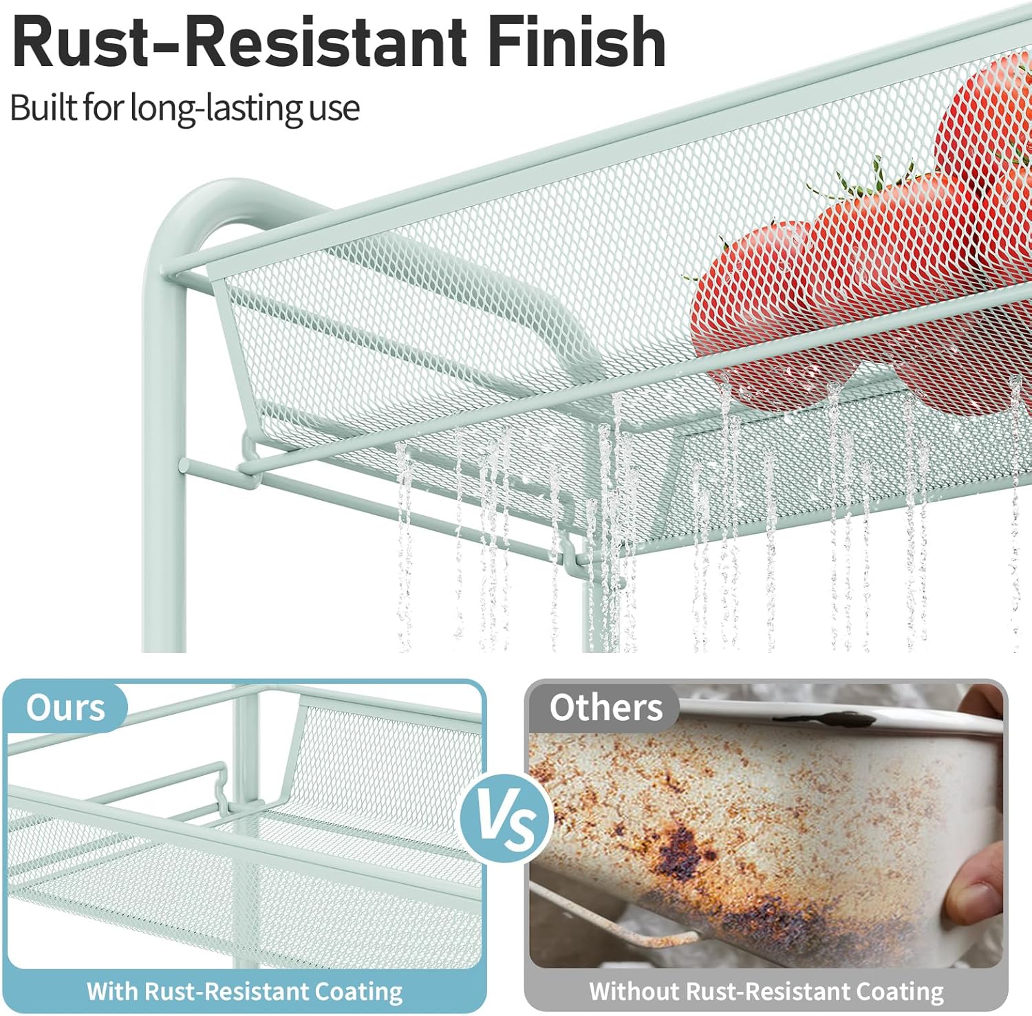 • 【Premium Quality】The mesh storage cart is made of high-grade metal material. Sturdy frame and rust-resistant process make it durable. Ergonomic handle and poles will not deform easily. Smooth surface won't scratch you.The weight capacity of each metal basket is up to 5kg(11lbs).