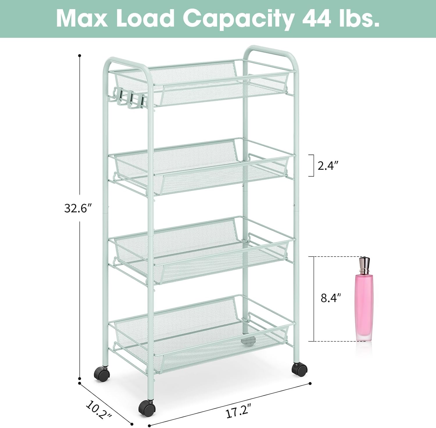 • 【Breathable Mesh Basket】Our rolling utility cart with breathable mesh basket, convenient for draining. Basket with 6cm (2.4") heighten edge to prevent items dropping and with good load-bearing capacity. The weight capacity of each metal basket is up to 5 kg