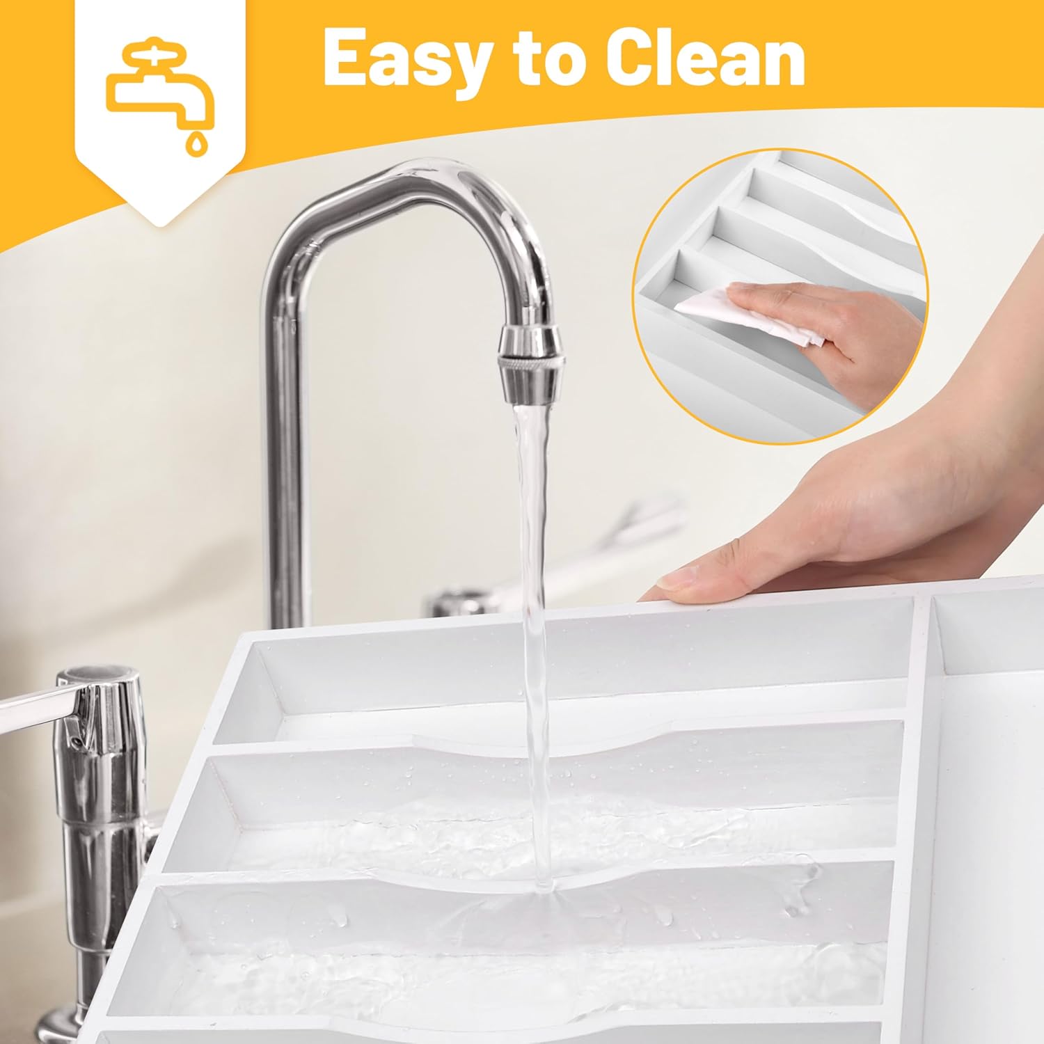 - ✅【Multifunctional Design For Your Needs】Our multi-purpose cutlery organizer is not only suitable for storing silverware, but also with large capacity & deep grooved edges, the storage tray can also be used to organize your office, bathroom sink drawer, dresser, & craft corner, being perfect to sort pencils, pens, grooming supplies, makeup brushes and lipsticks, or art supplies like paintbrushes and charcoal.