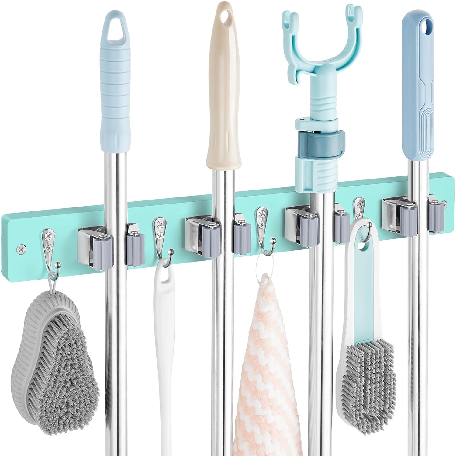 Turquoise Mop Broom Holder Wall Mount with 4 Slots & 4 Hooks - Wood Broom Mop Hanger for Pantry Closet Laundry Room Organization - for Teal Kitchen Decor and Accessories